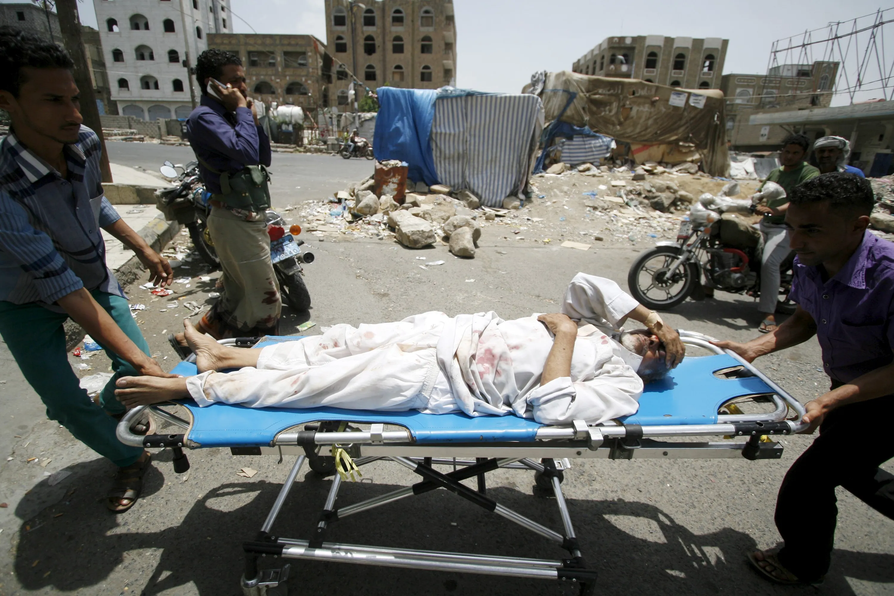 People carry a man injured in a crossfire during fighting between members of the Popular Resistance Committee and Houthi fighters in Yemen's southwestern city of Taiz April 27, 2015. (Photo by Reuters/Stringer)