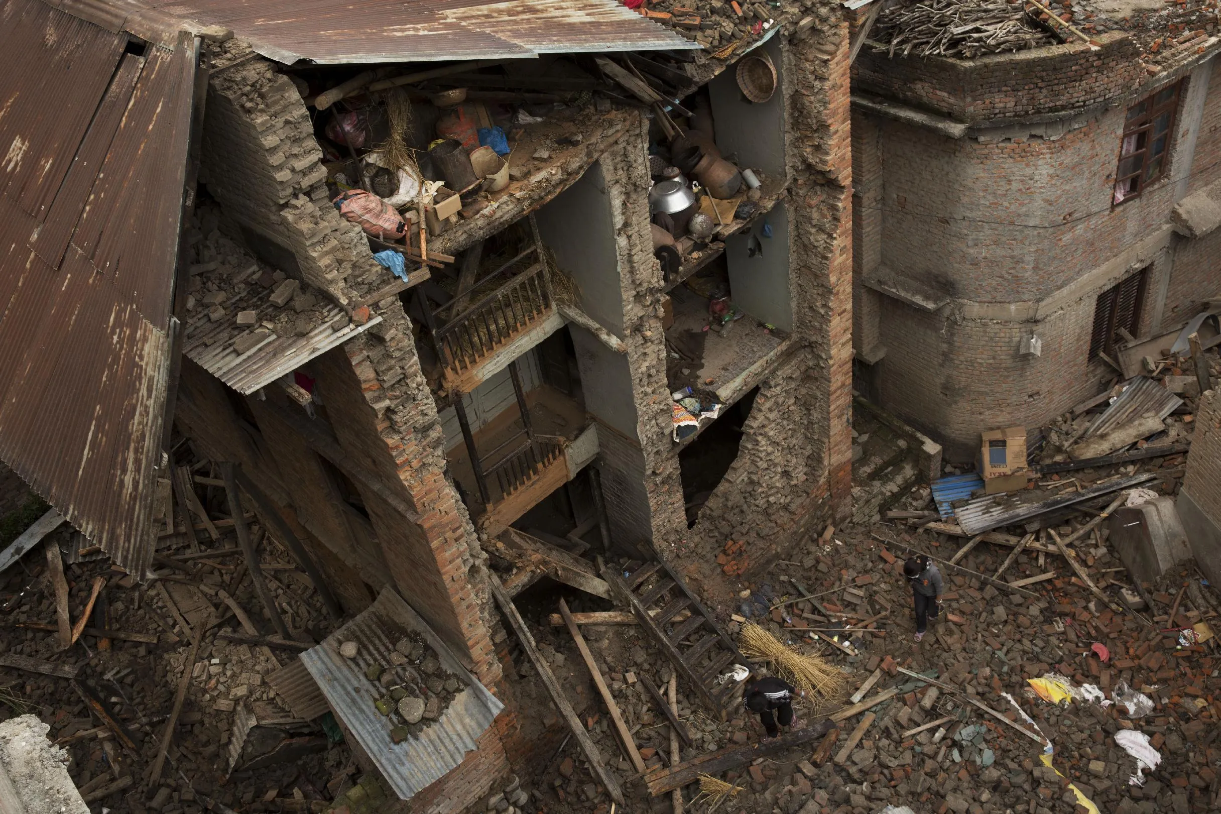 People walk past a house with one side of its walls completely destroyed by Saturday's earthquake in Sakhu, on the outskirts of Kathmandu, Nepal, Wednesday, April 29, 2015. (Photo by Bernat Amangue/AP Photo)
