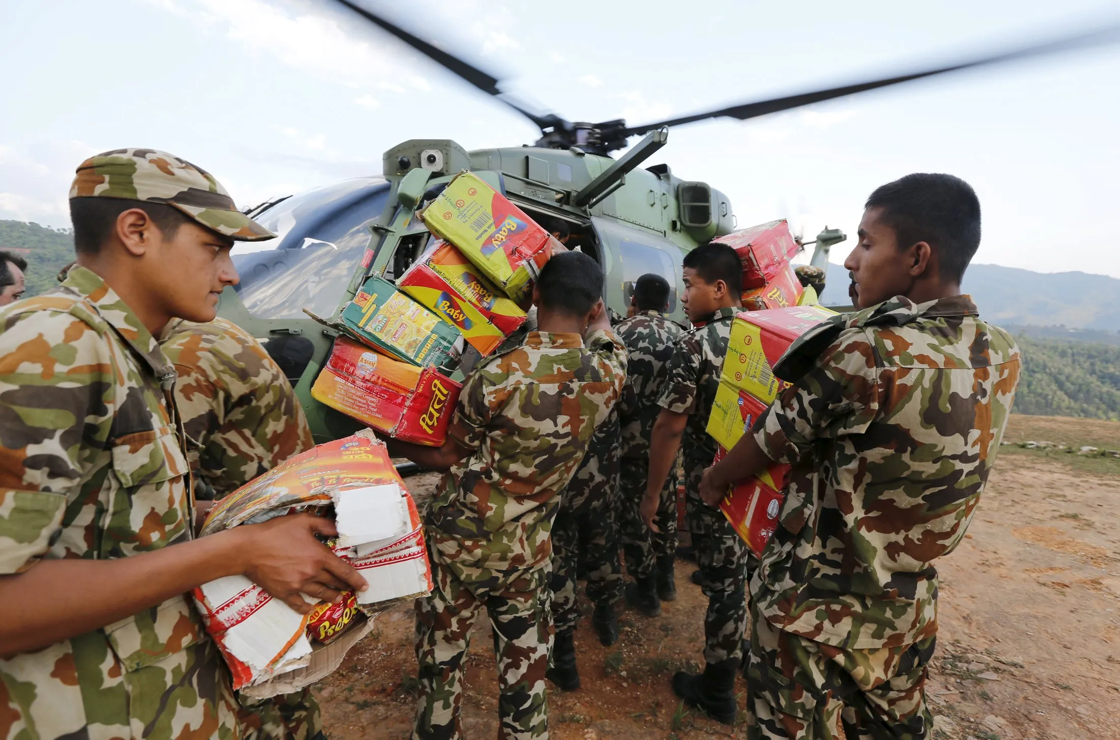 Nepalese soldiers load goods into an army helicopter in Gorkha, Nepal, to supply remote areas near the epi-centre of Saturday's earthquake with food and other needs, April 29, 2015. (Photo by Wolfgang Rattay/Reuters)
