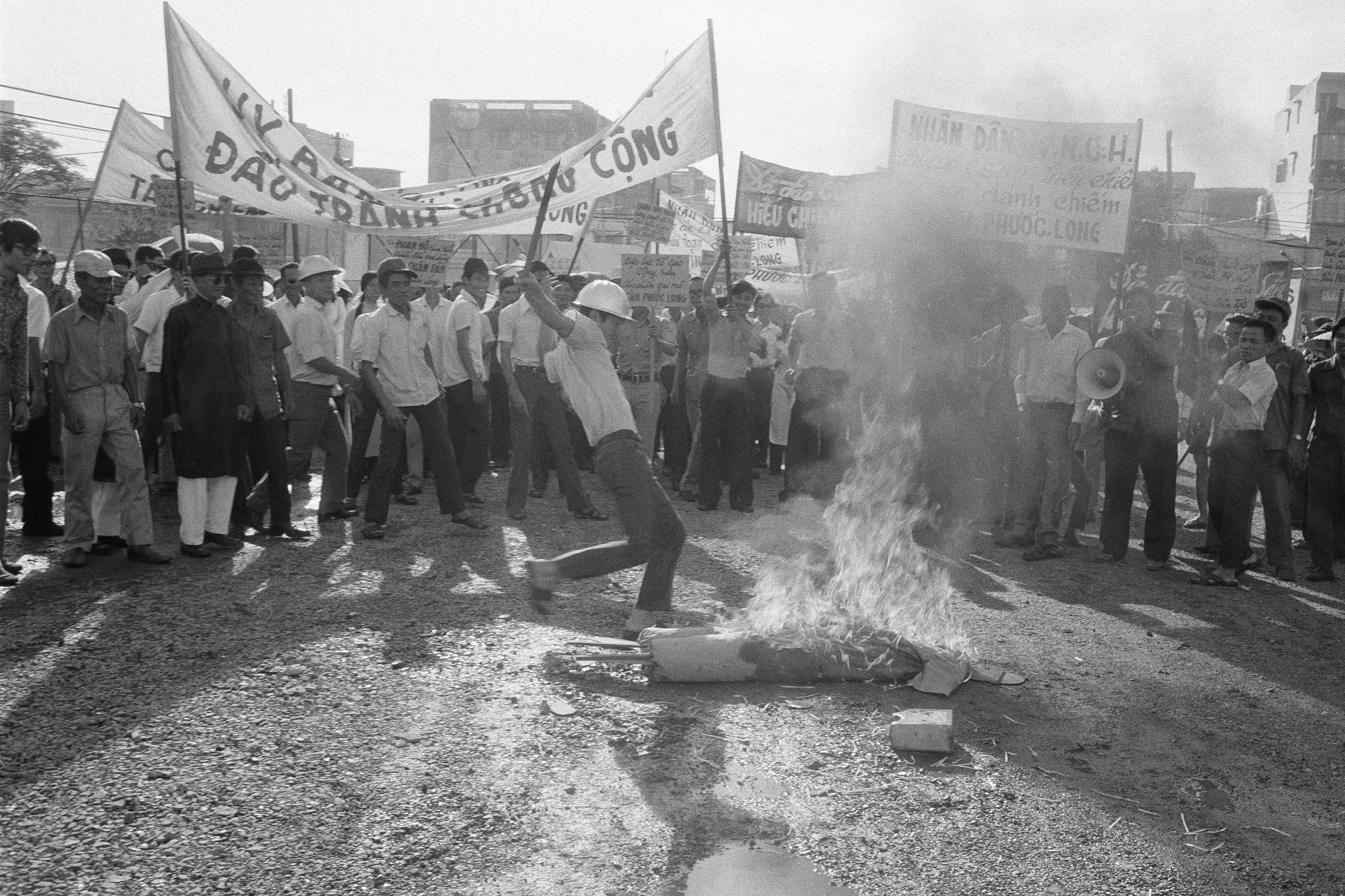 Anticommunist demonstrator kicks burning effigy of Viet Cong soldier during unruly protest outside Saigon headquarters of International Commission of Control and Supervision in Saigon, Jan. 6, 1975. About a hundred demonstrators protested fierce fighting in Phuoc Long province in violation of the Paris peace agreement, which the ICCS is charged with enforcing. (Photo by AP Photo)