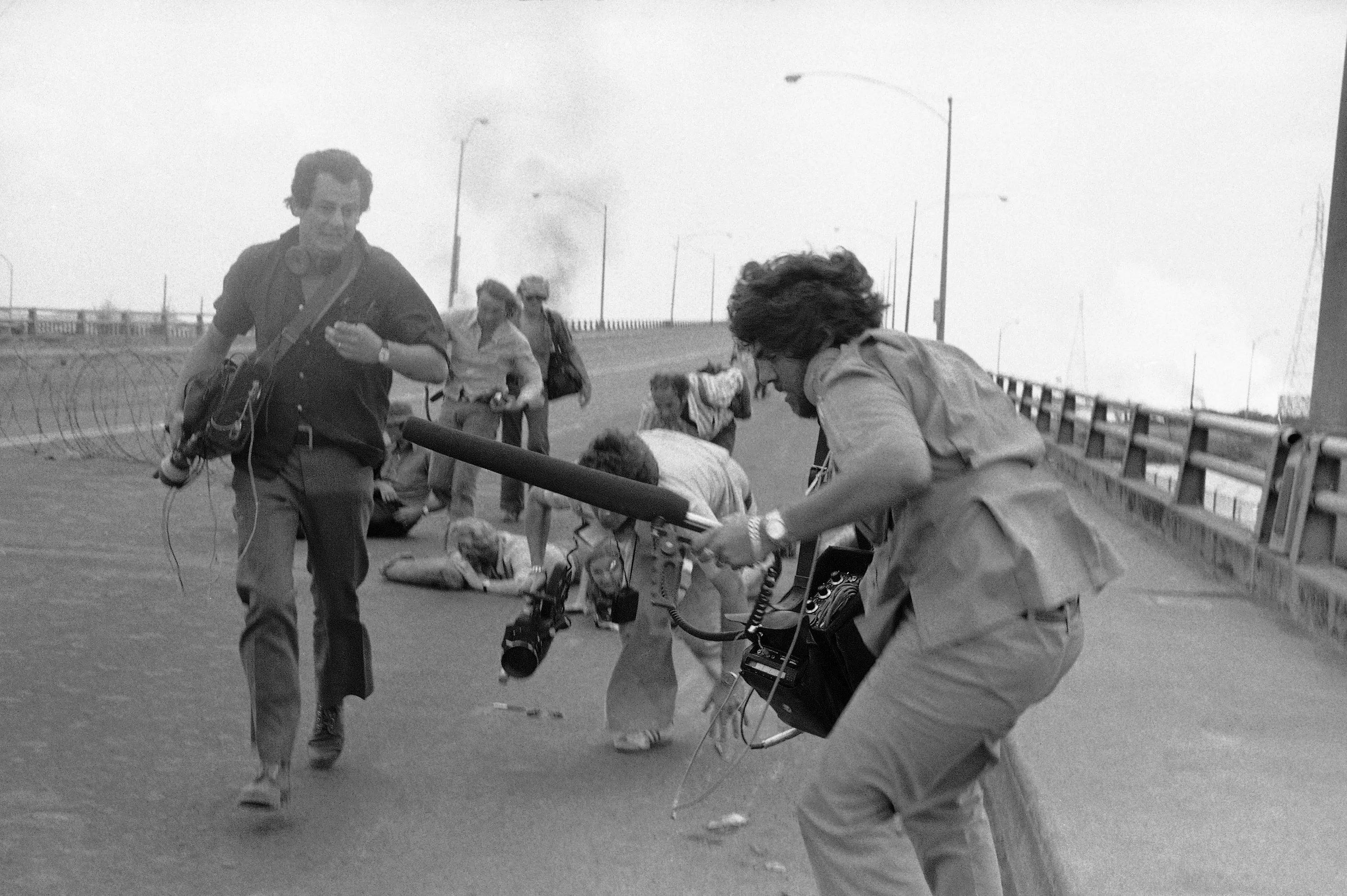Unidentified members of a television news crew run for cover in Saigon on Monday, April 28, 1975 during fighting between South Vietnamese Government troops and Communist forces on the northern outskirts of Saigon. (Photo by Thauh Nuy/AP Photo)