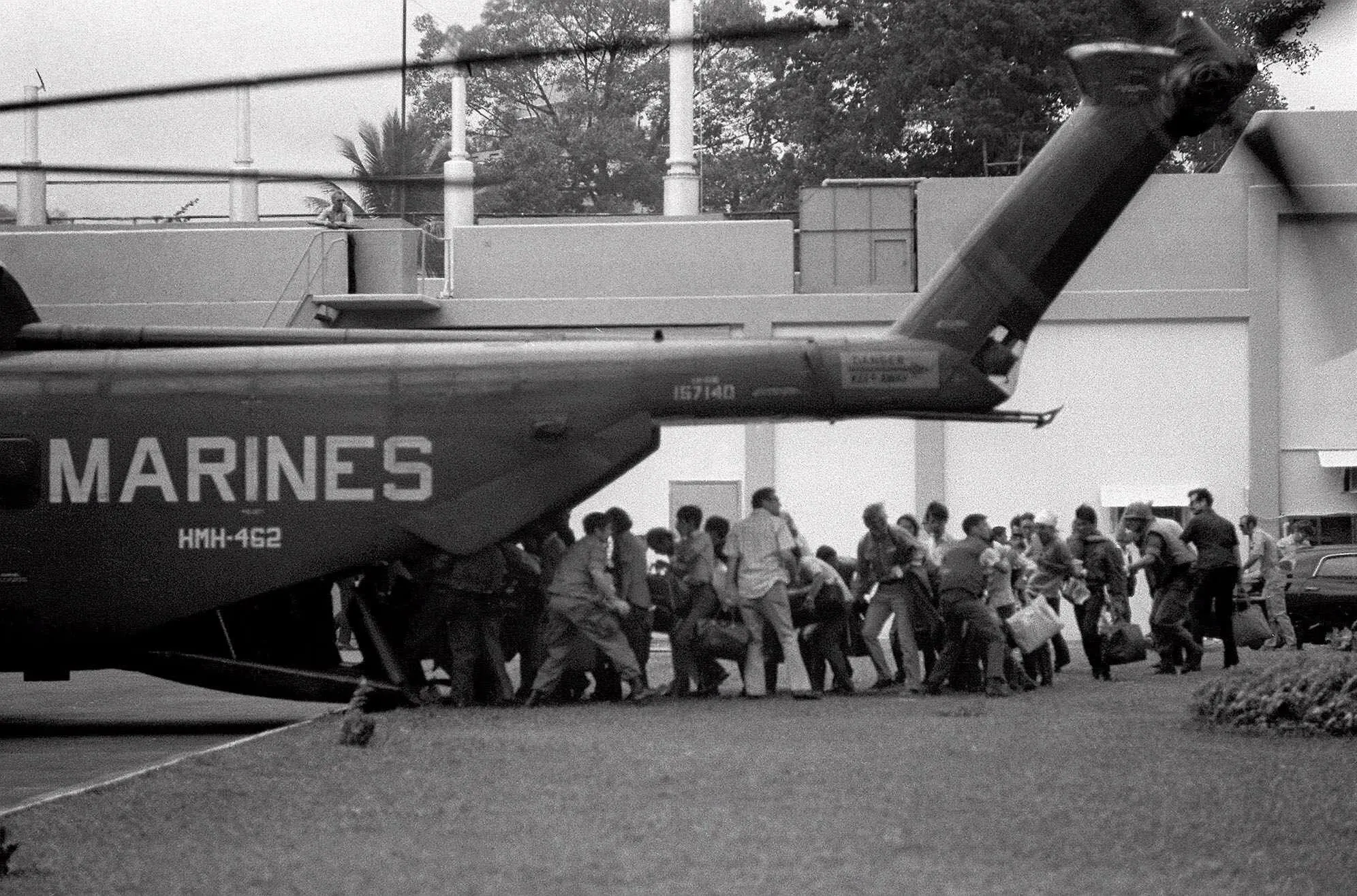 Authorized U.S. military and civilian personnel rush to board a Marine helicopter during the evacuation of the U.S. Embassy in Saigon, April 29, 1975. (Photo by Neal Ulevich/AP Photo)