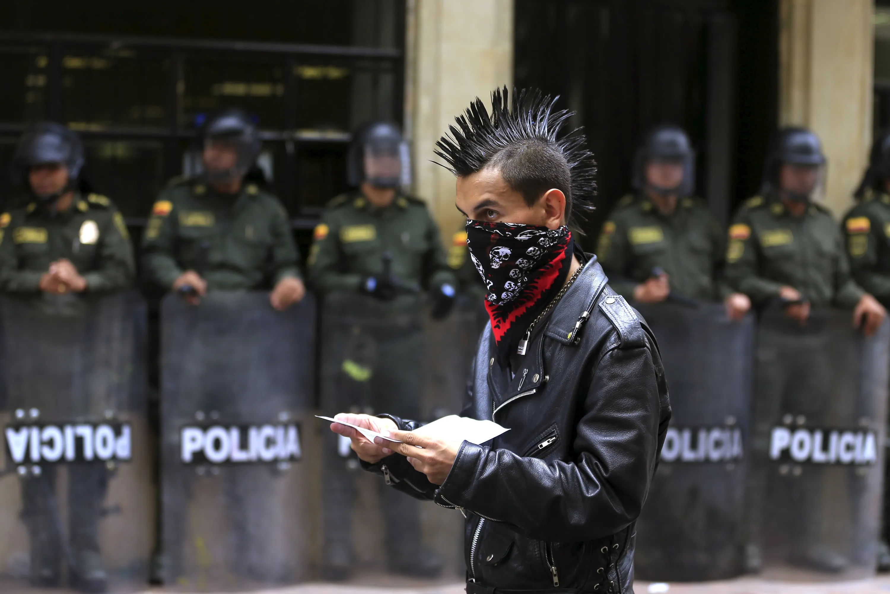 A demonstrator walks in front riot policemen during protests for Labor Day in Bogota, Colombia May 1, 2015. (Photo by Jose Miguel Gomez/Reuters)