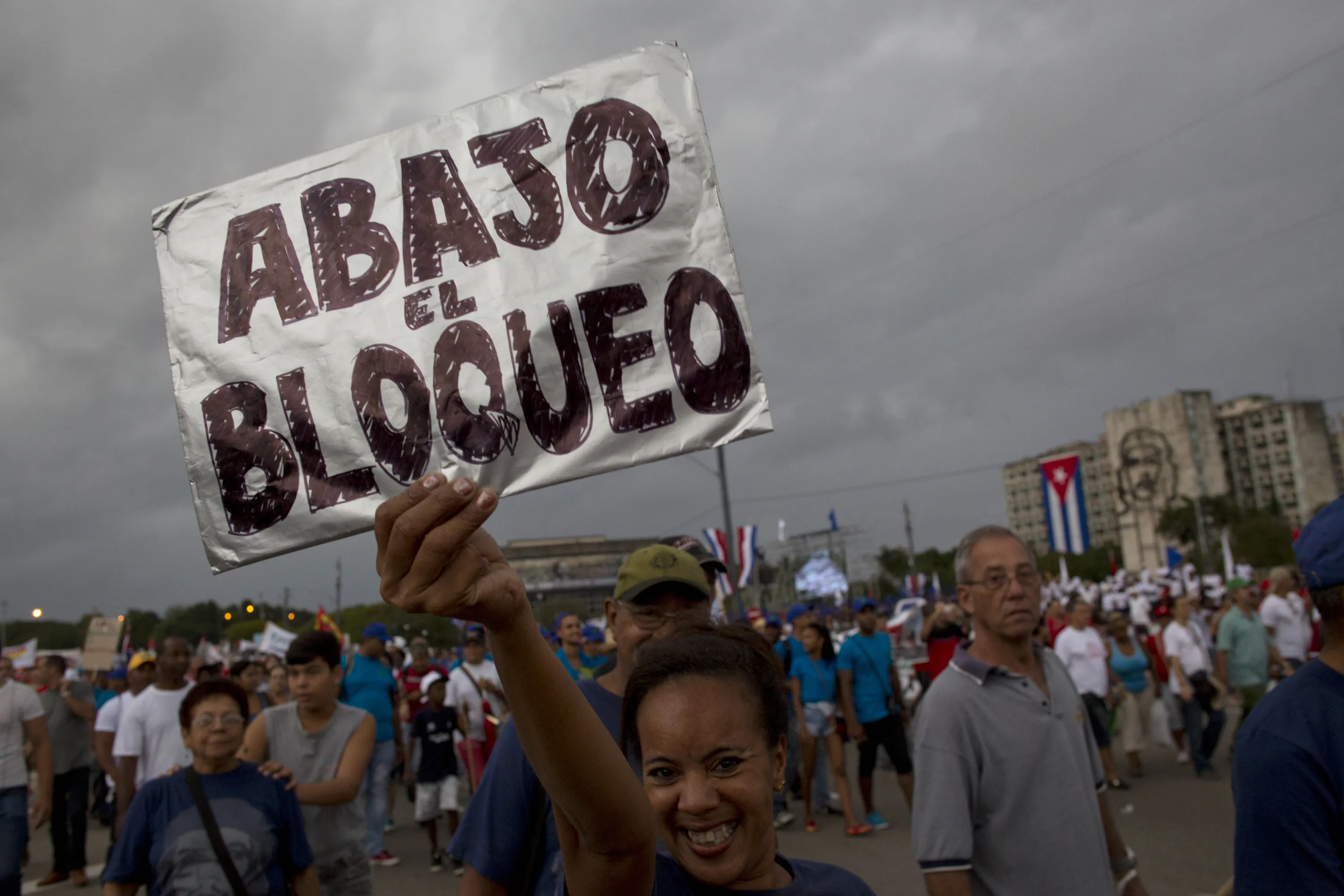 A woman holds up a handwritten sign against the U.S embargo during a march in Revolution Square marking May Day, in Havana, Cuba, Friday, May 1, 2015. (Photo by Ramon Espinosa/AP Photo)