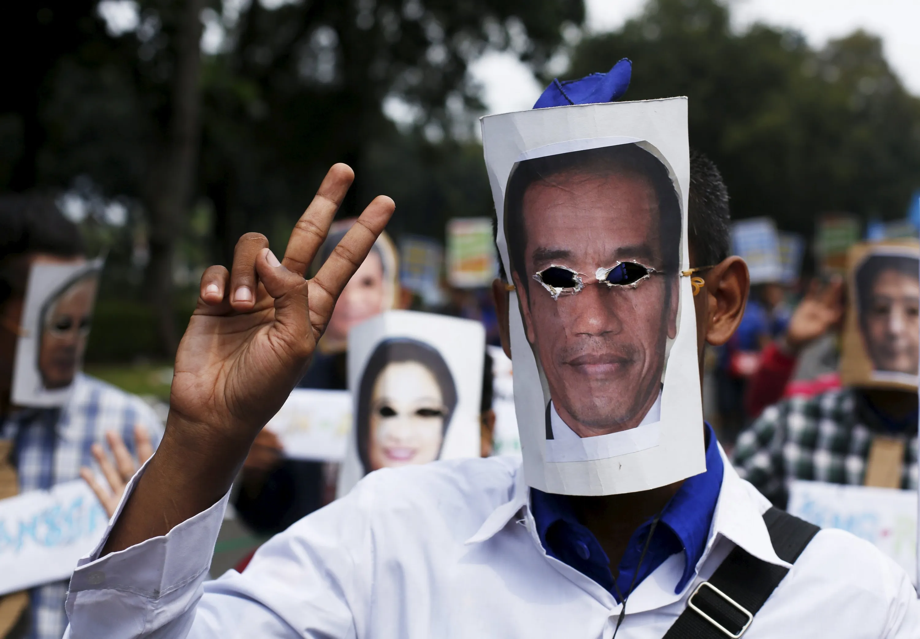 A demonstrator wears a mask of Indonesia President Joko Widodo during a May Day rally in Jakarta, Indonesia, May 1, 2015. (Photo by Reuters/Beawiharta)