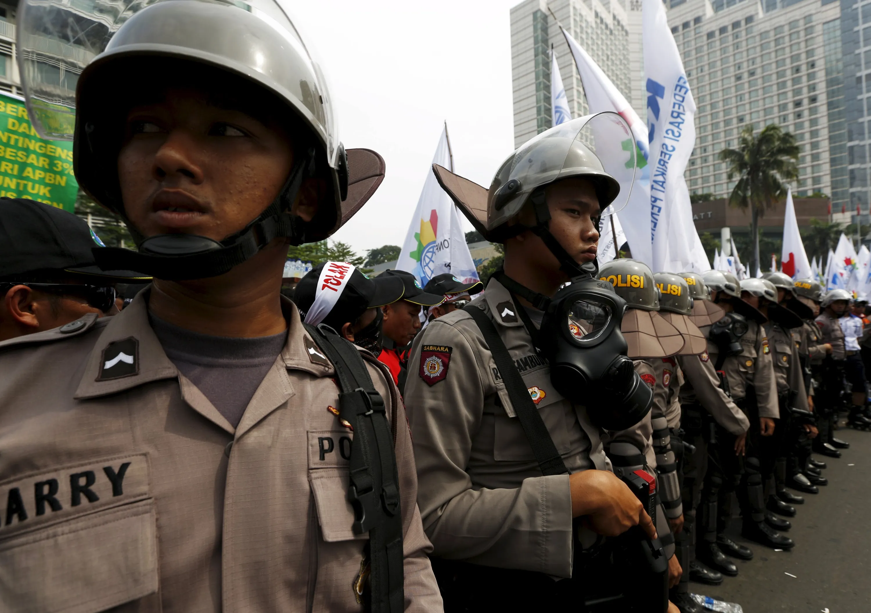 Policemen stand guard as workers hold a May Day rally at a business district in Jakarta, Indonesia, May 1, 2015. (Photo by Reuters/Beawiharta)