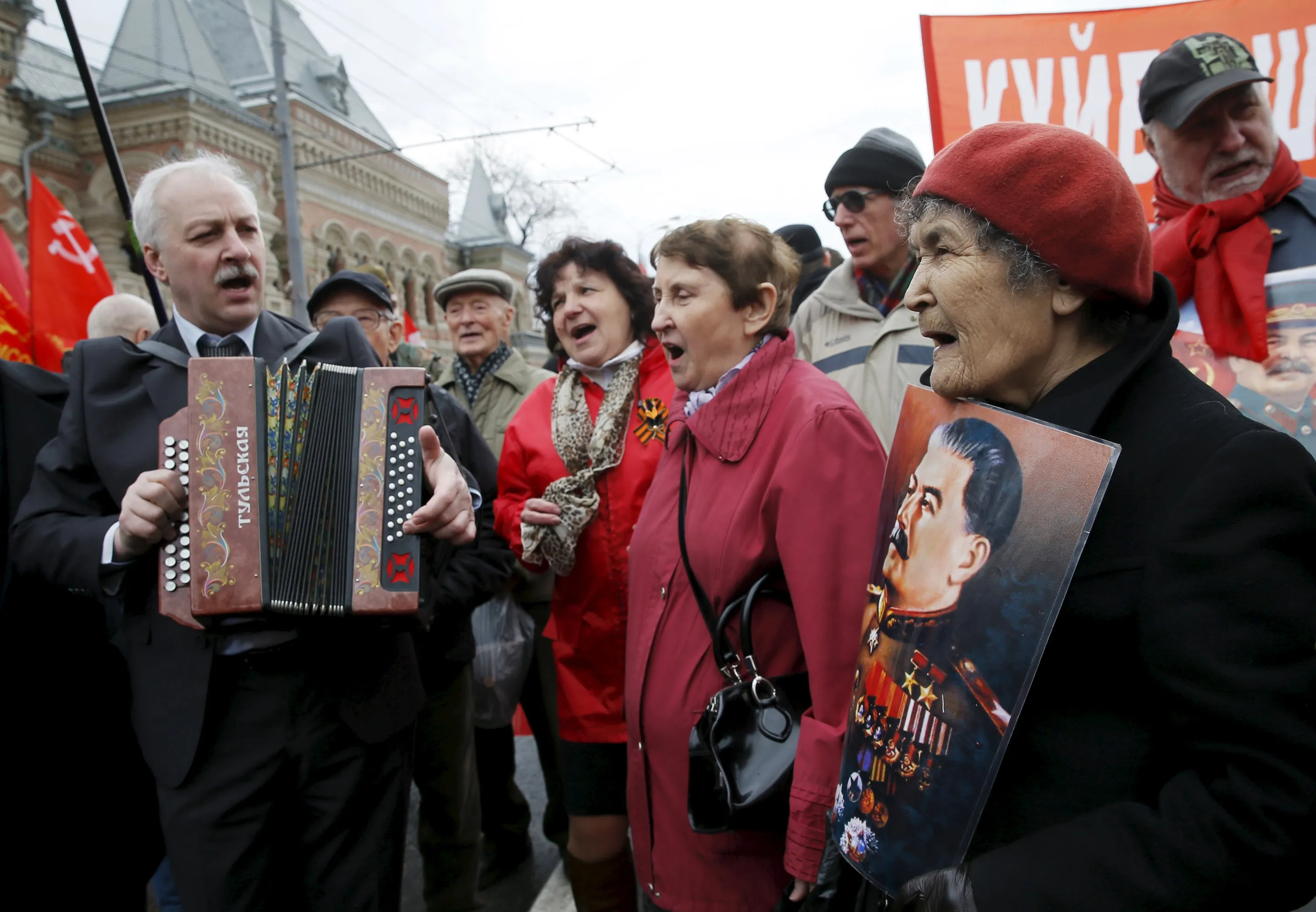 Supporters of Russia's Communist party sing as they take part in a May Day rally in Moscow May 1, 2015. International Workers' Day, also known as Labour Day or May Day, commemorates the struggle of workers in industrialised countries in the 19th century for better working conditions. (Photo by Maxim Shemetov/Reuters)