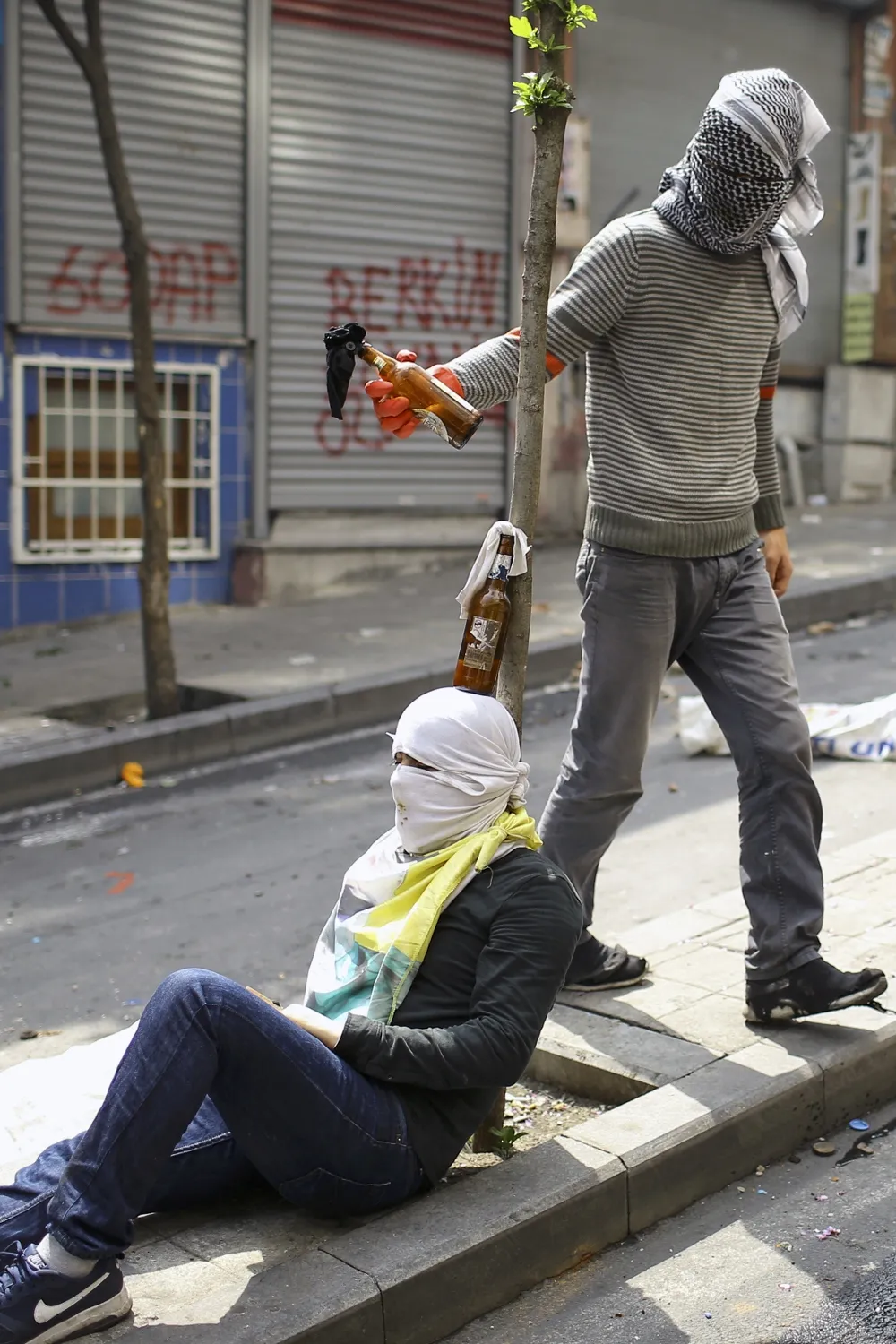 Two protesters play with Molotov cocktails during clashes with police in Okmeydani neighborhood in Istanbul, Turkey, May 1, 2015. (Photo by Huseyin Aldemir/Reuters)