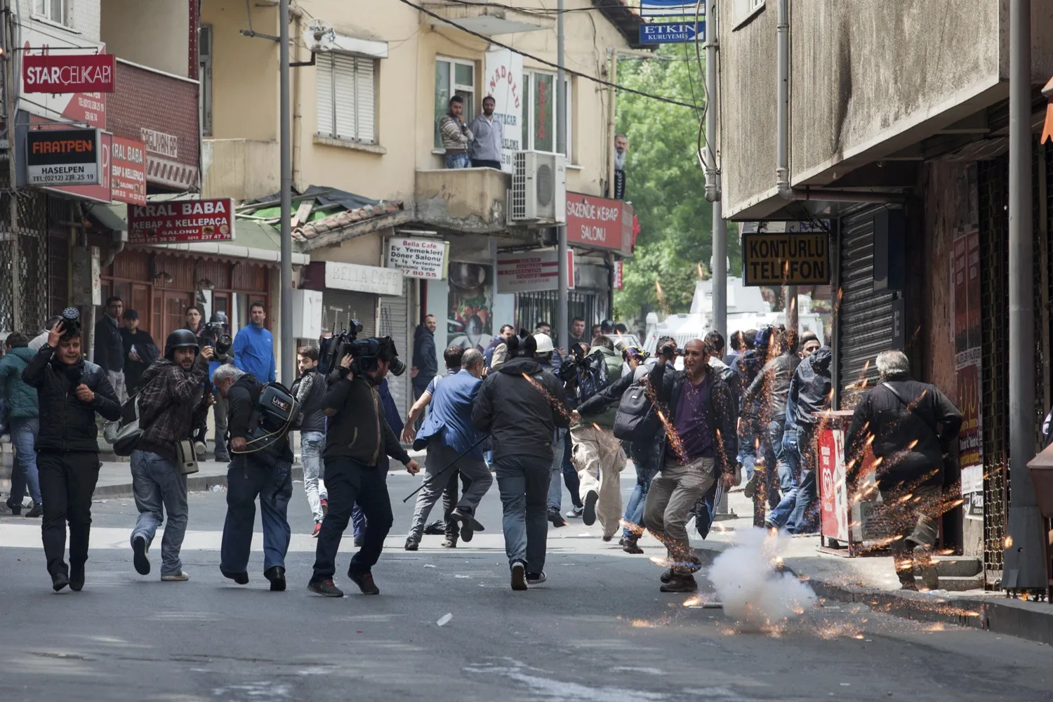 Journalists run as fireworks explode in the street during clashes with police in Okmeydani neighbourhood in Istanbul, Turkey, May 1, 2015. (Photo by Kemal Aslan/Reuters)