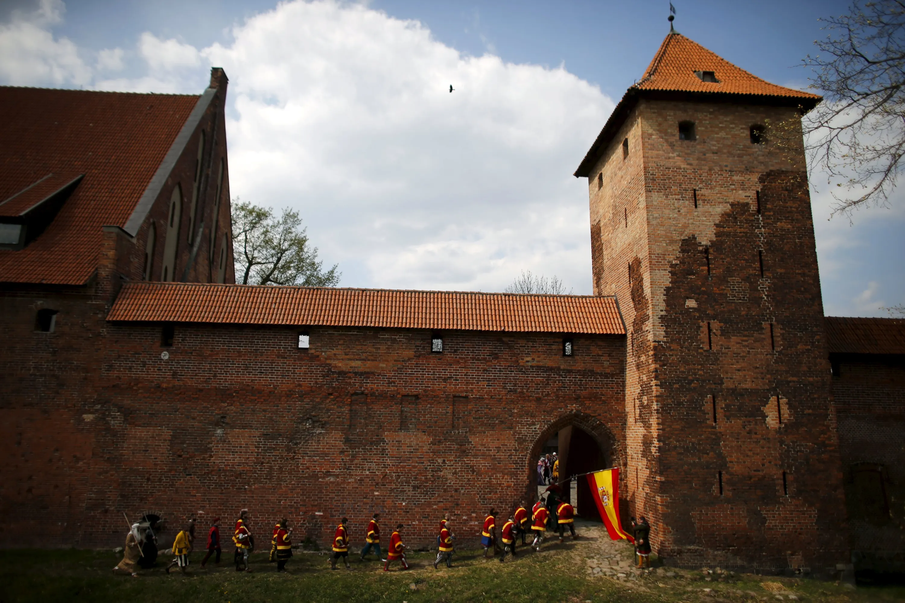 The Spanish team walks before taking part in the opening ceremony parade of the Medieval Combat World Championship at Malbork Castle, northern Poland, April 30, 2015. Medieval combat is a full contact sport that revives the foot based tournament fighting of medieval Europe. Countries fight in refereed matches where the objective is to get the opposing team to the floor. There are also duels with polearms, swords and shields where the number of hits landed are scored. The fighters, both male and female, wear heavy armours and weapons, mostly replicas of authentic pieces, and fight following the knights code of conduct. According to organizers, 25 nations from 6 continents are taking part in the Championships, which started on April 30 and will go on until May 3. (Photo by Kacper Pempel/Reuters)
