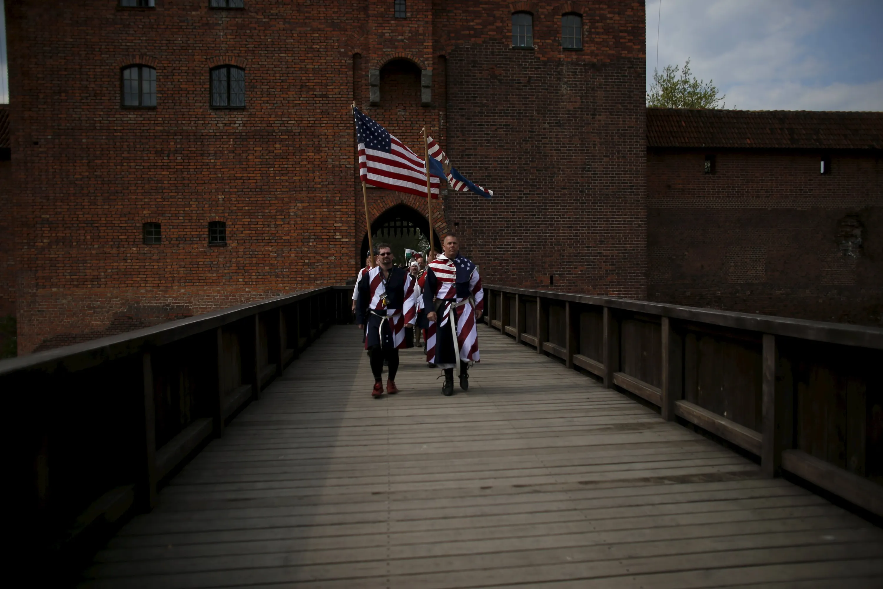 Members of the U.S. team walk with the national flags as they take part in the opening ceremony parade of the Medieval Combat World Championship at Malbork Castle, northern Poland, April 30, 2015. (Photo by Kacper Pempel/Reuters)