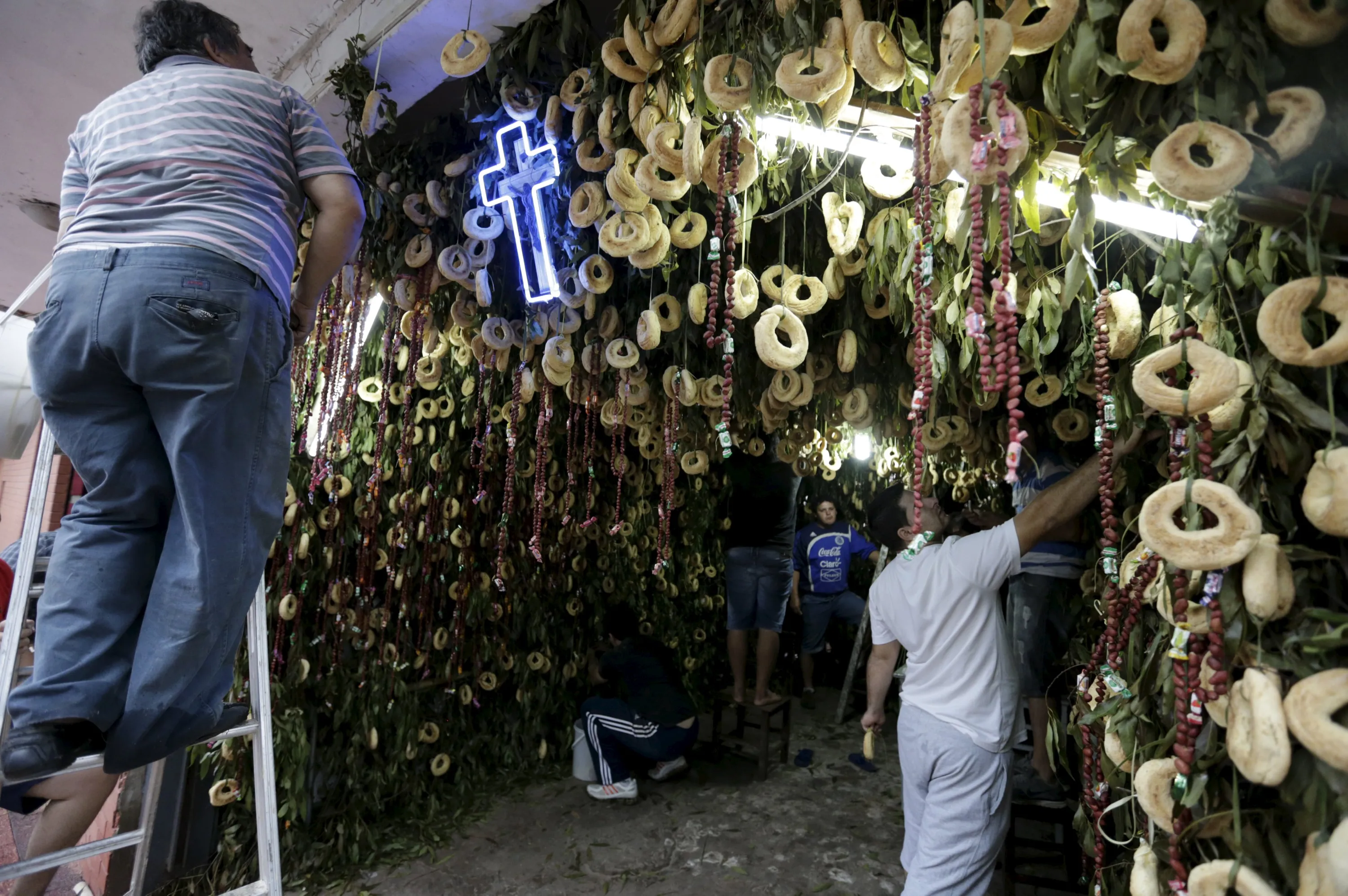 The Antar family decorates an altar with some 3,000 traditional cheese and corn buns called “chipas”, in celebration of Kurusu Ara in Asuncion May 3, 2015. (Photo by Jorge Adorno/Reuters)