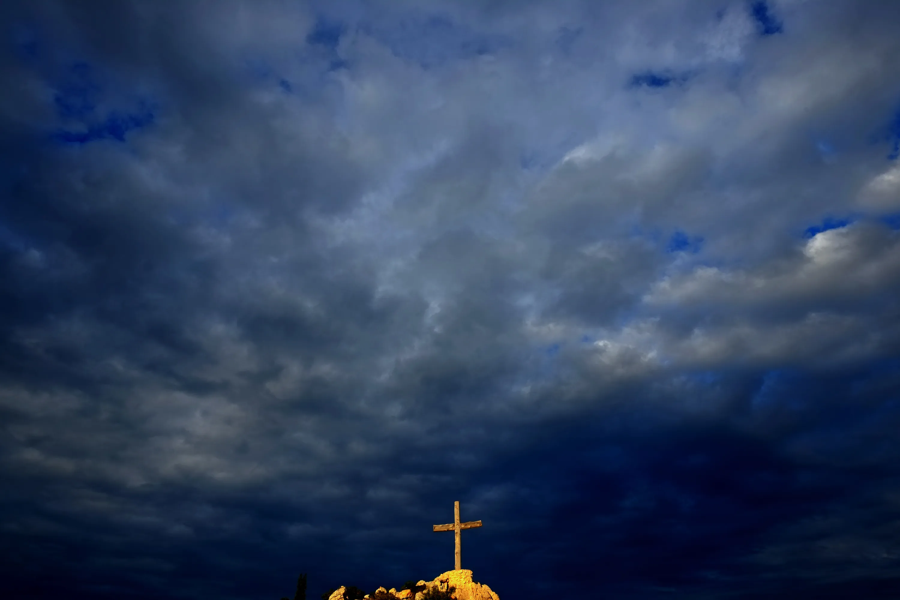 Clouds rise over the wooden cross on a hill rock at Ayios Epiphanios Christian Orthodox church in southeast coastal resort of Ayia Napa, Cyprus, Saturday, April 11, 2015. Orthodox Christians are observing Holy Week before celebrating Easter on Sunday. In Cyprus on holy Saturday, the traditional Easter bonfires, or “lambradjia”, are lit to burned effigies of Judas Hiscariot, the disciple thought to have betrayed Jesus. (Photo by Petros Karadjias/AP Photo)