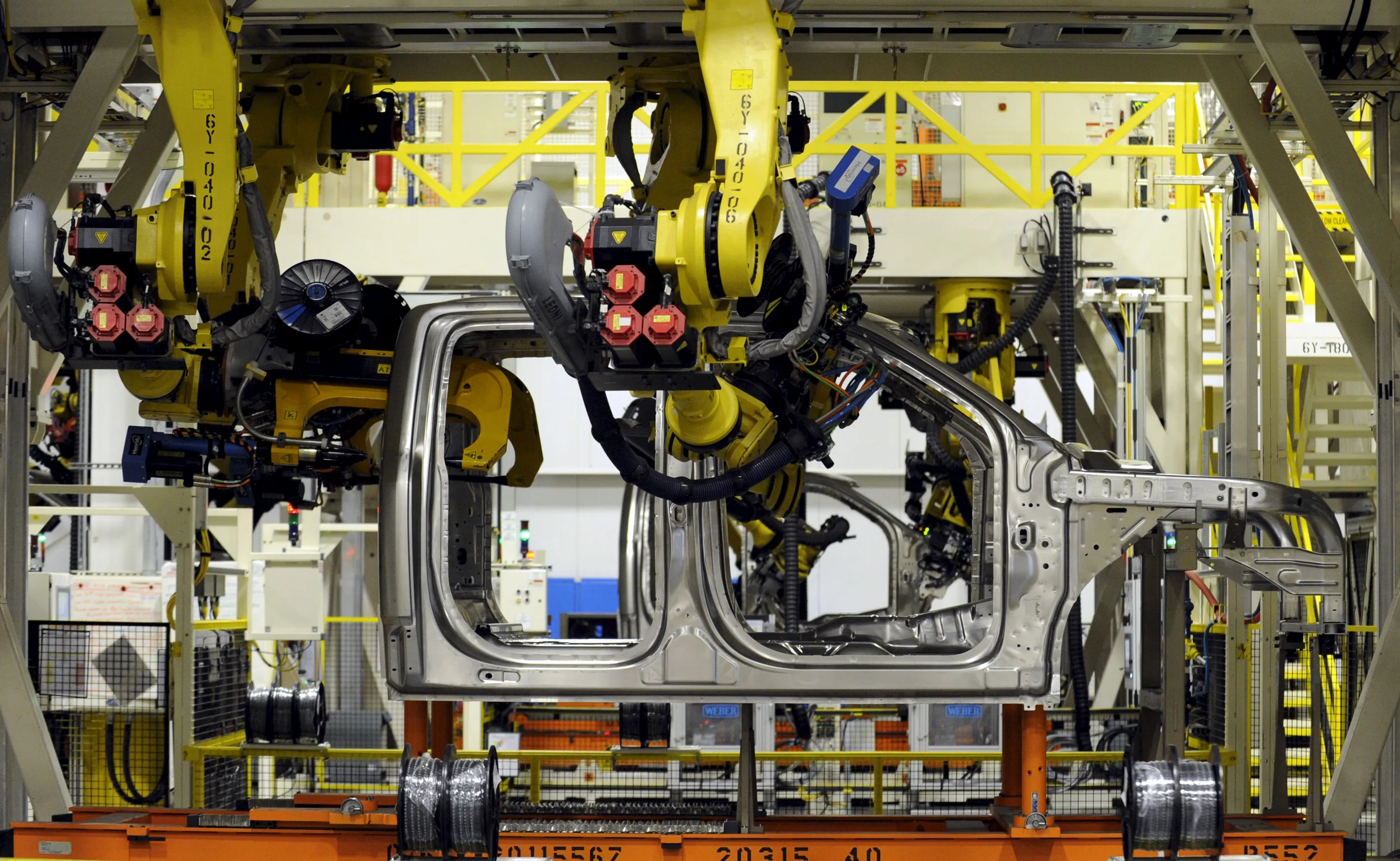 Robotic arms rivet together the cab of a Ford F150 pickup at the Kansas City Assembly Plant where new aluminum intensive Ford F-Series pickups are built in Claycomo, Missouri May 5, 2015. (Photo by Dave Kaup/Reuters)