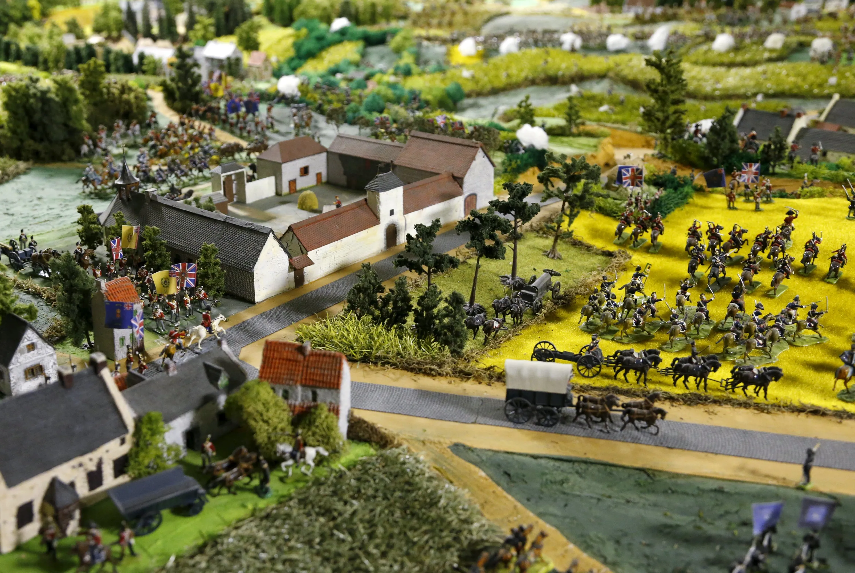 The Mont-Saint-Jean farm is seen near figurines representing soldiers of the British army on a 40-square-metre miniature model of the June 18, 1815 Waterloo battlefield, in Diest, Belgium, in this picture taken on April 29, 2015. Waterloo enthusiast Willy Smout said he spent 40,000 hours and around 150,000 euros over the past 40 years, to recreate the battlefield as closely as possible in a purpose-built room in his house. (Photo by Francois Lenoir/Reuters)