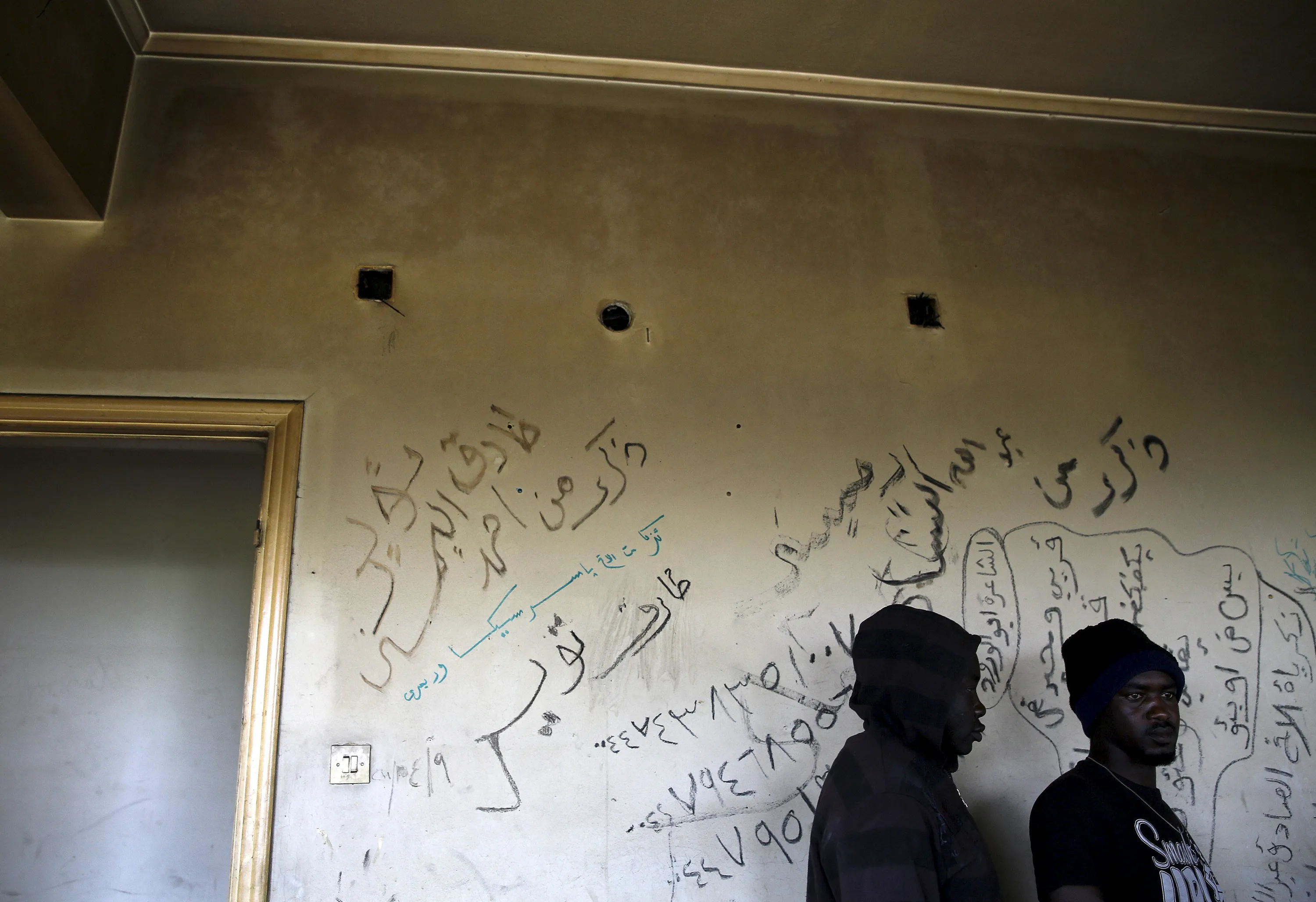 Sudanese immigrants are seen in front of a wall covered in graffiti names inside a deserted textile factory in the western Greek town of Patras April 28, 2015. (Photo by Yannis Behrakis/Reuters)