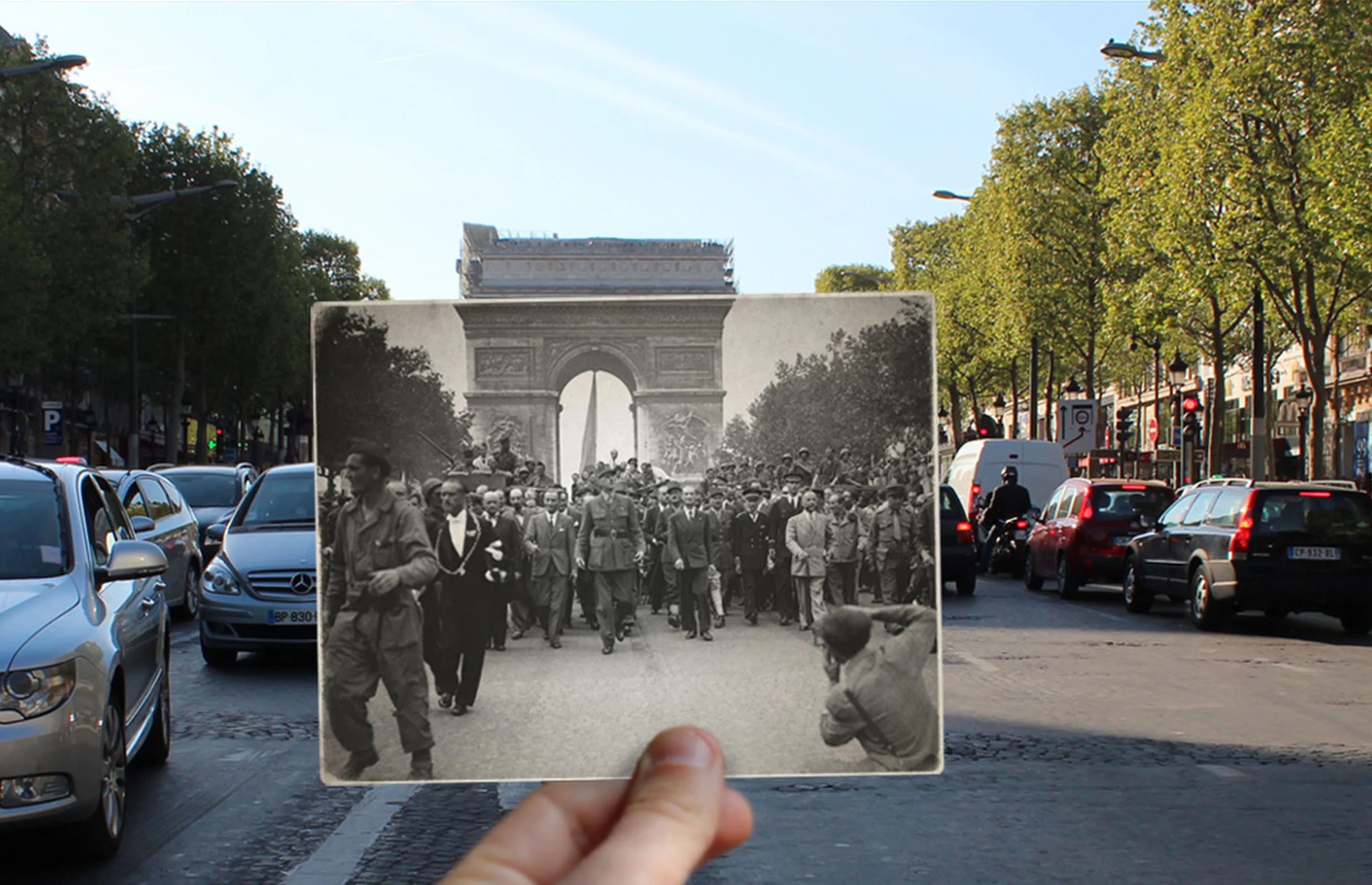 It is already one of the world’s most iconic cities, but this incredible collection shows how much Paris has changed over the course of the past century. The collection, by French photographer Julien Knez, shows Paris in the 1940s against a backdrop of how the same places look today. Knez says he put the striking collection together to celebrate the 71st anniversary of the city’s liberation from Nazi control in August 1944. Pictures featured include Place de la Bastille, which gained notoriety as a focal point of the French Revolution, as well as various streets in and around the French capital, including Rue de la Huchette and Place Saint-Michel. Pictures from 1944 show different places being guarded by Nazi soldiers and survivors of bomb attacks picking through rubble, a stark contrast to a scene of relative serenity in the modern day. Here: President De Gaulle on the Champ Elysees, with the Arc De Triomphe in the background. (Photo by Julien Knez/Caters News)