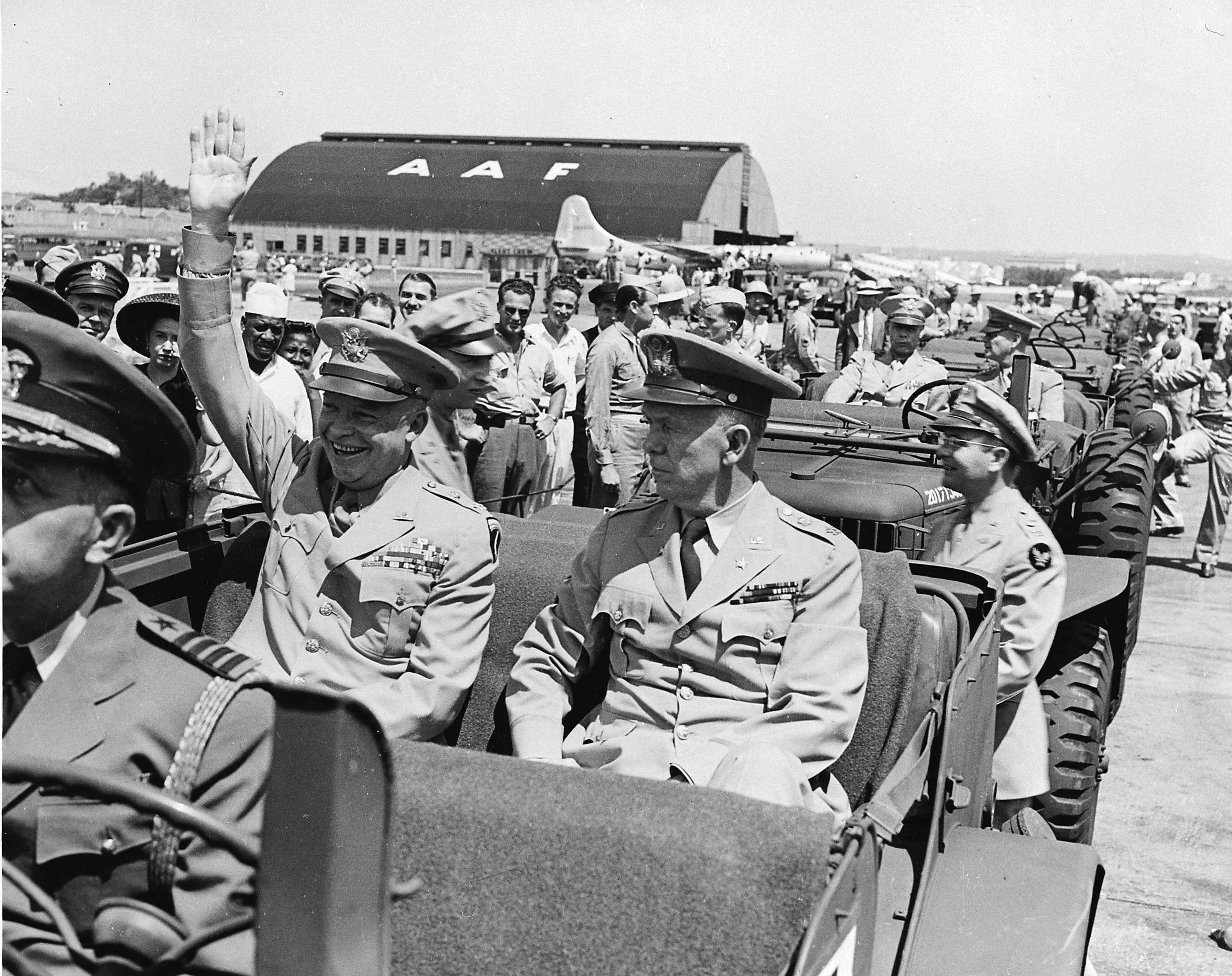 U.S. General Dwight D. Eisenhower (L) sits in the back of a jeep with U.S. Army Chief of Staff General George C. Marshall, as he waves to spectators at the Washington National Airport, in Arlington, Virginia, on June 18 1945, in this handout photo provided by the United States National Archives and Records Administration. (Photo by Reuters/United States National Archives and Records Administration)