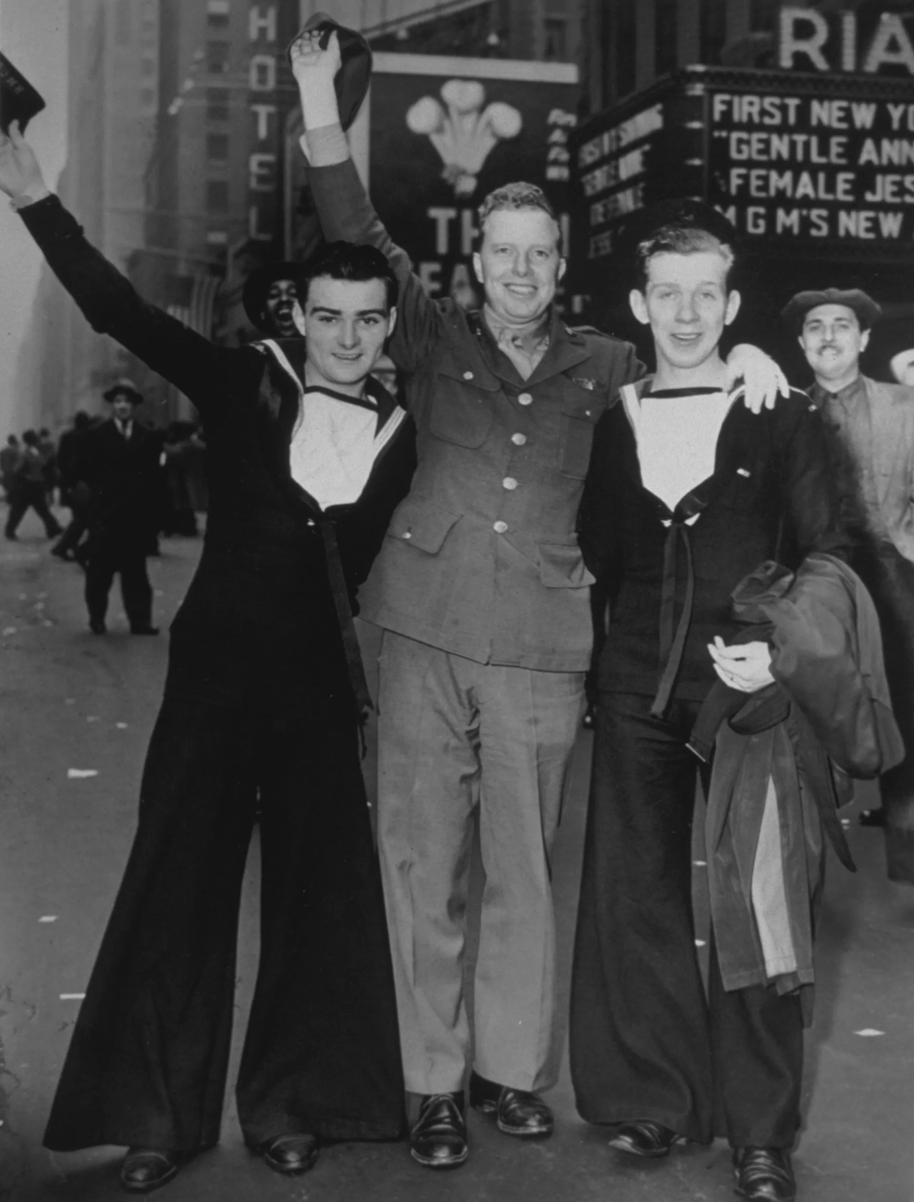 8th May 1945: An American soldier flanked by two British sailors, in New York City, greeting the news of Germany's unconditional surrender with waves and cheers. (Photo by Fox Photos/Getty Images)