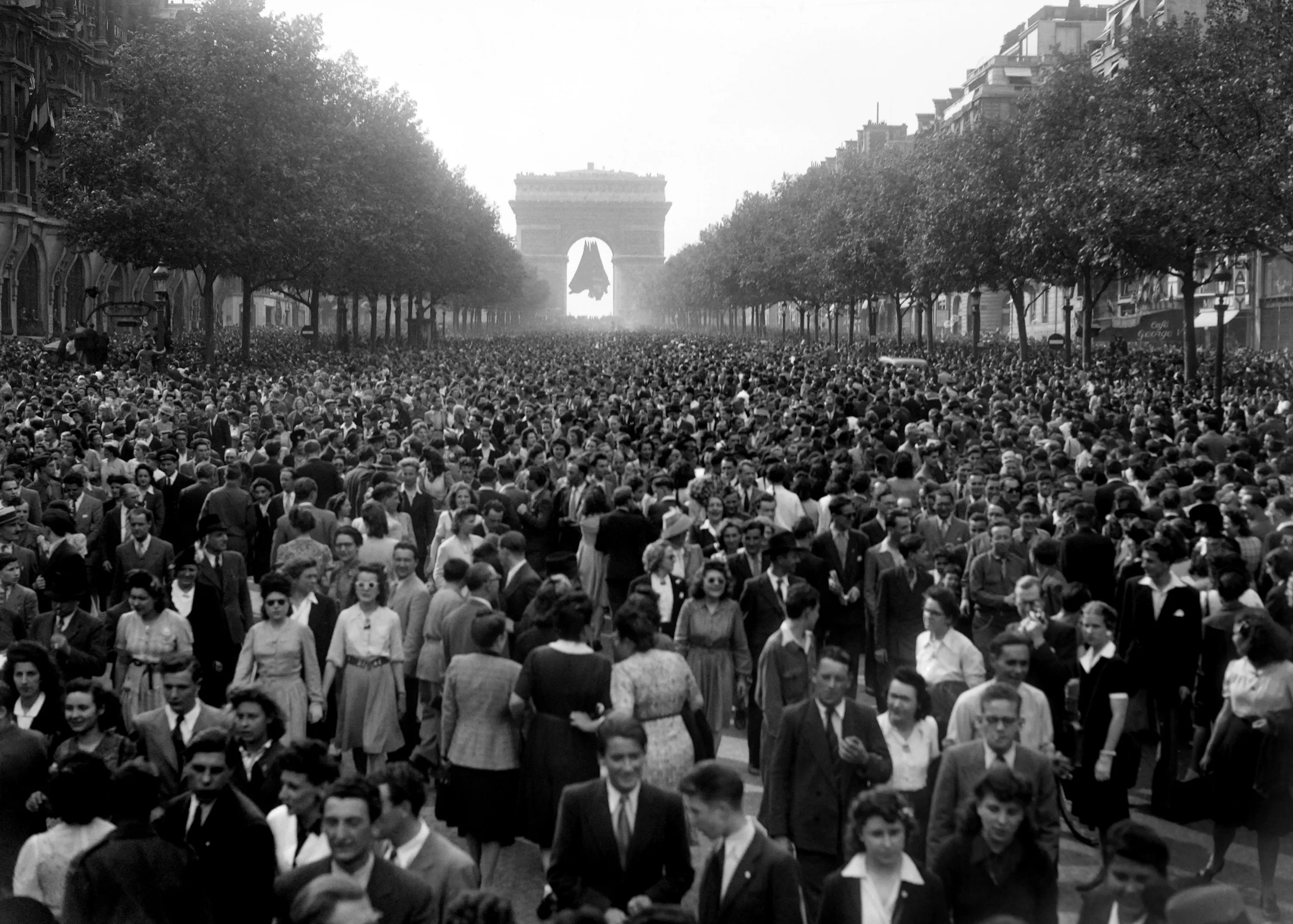 Picture dated of May 8, 1945 showing people gathering at the Champs Elysees Avenue, in front of the Triumphal Arch (Arc de Triomphe) as Parisians celebrate the unconditionnal German capitulation in the streets of Paris, at the end of the second World War. (Photo by AFP/Getty Images)