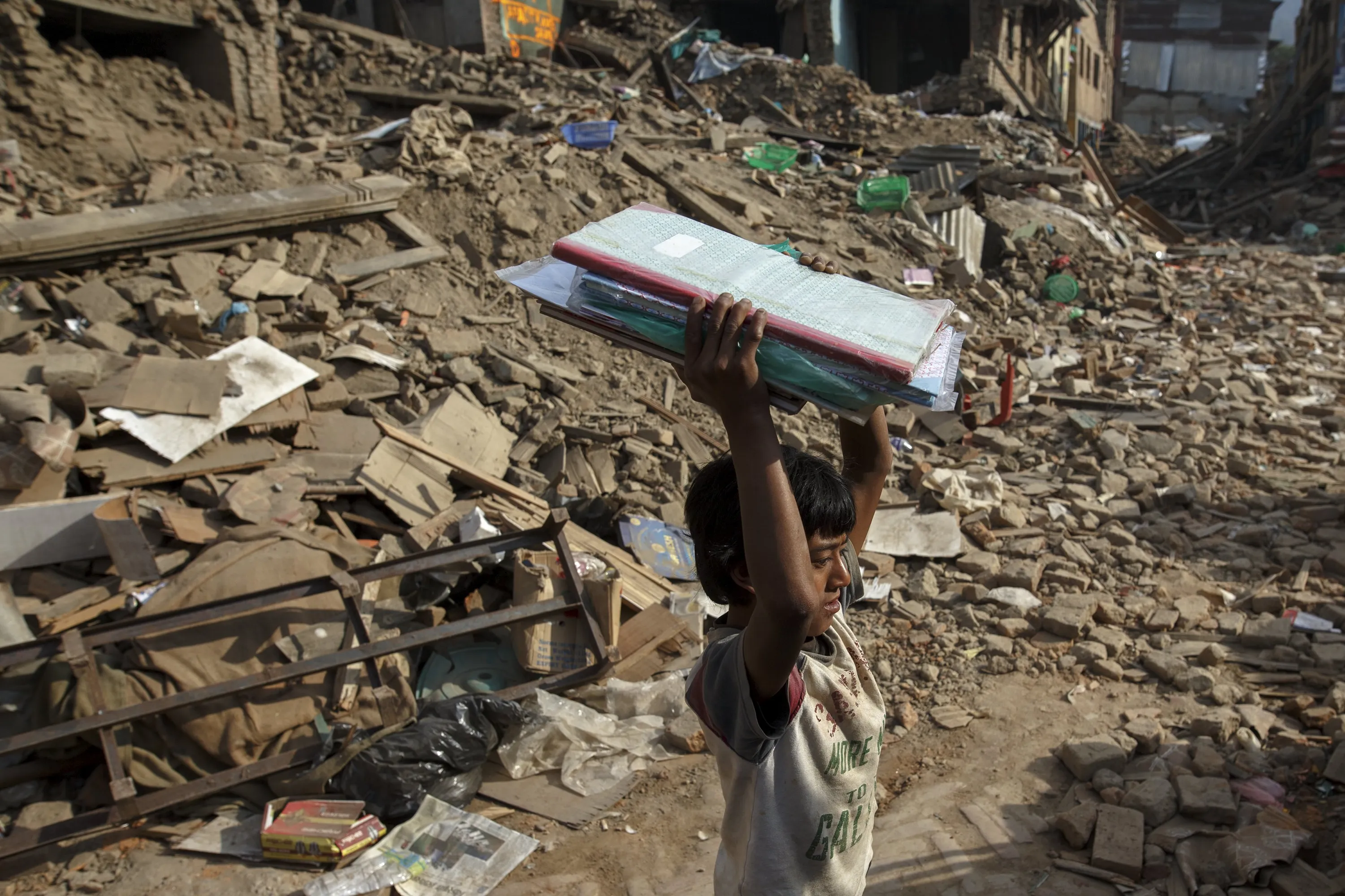 An earthquake survivor holds up salvaged belongings from his family's collapsed house in Sankhu, on the outskirts of Kathmandu, Nepal, May 5, 2015. (Photo by Athit Perawongmetha/Reuters)