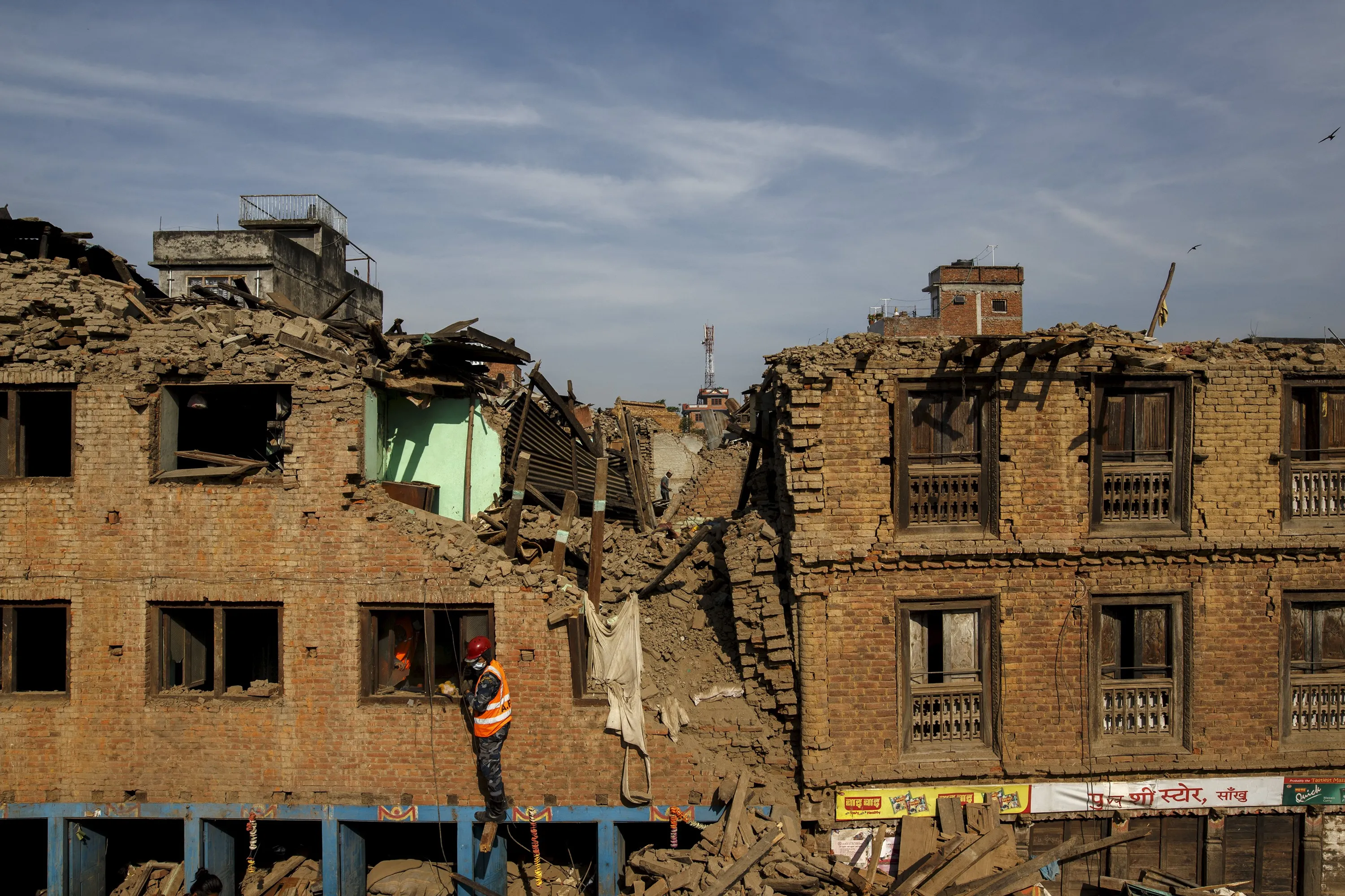 Nepalese military personnel climb up a collapsed house in Sankhu, on the outskirts of Kathmandu, Nepal, May 5, 2015. (Photo by Athit Perawongmetha/Reuters)