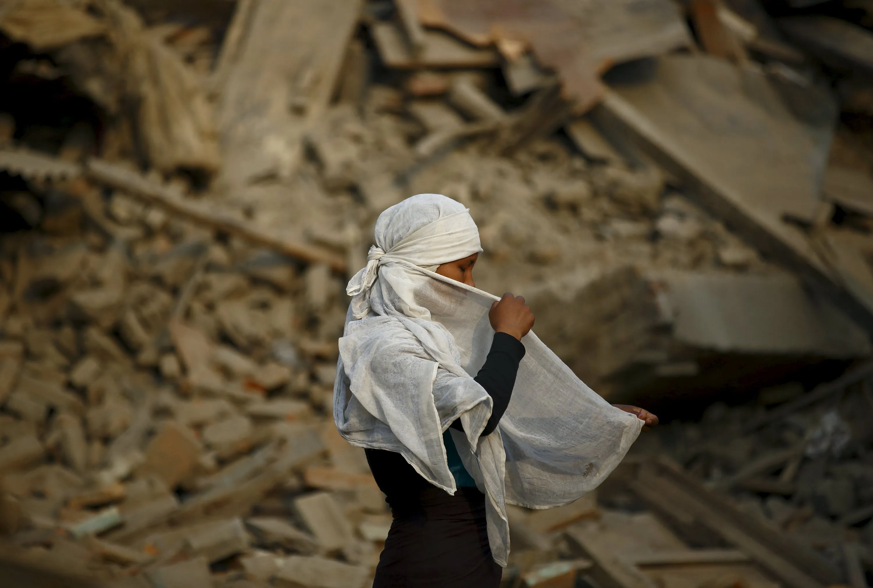 A woman ties a scarf around her face to protect from dust as she searches for her belongings in a collapsed house after the April 25 earthquake at Bhaktapur May 7, 2015. (Photo by Navesh Chitrakar/Reuters)