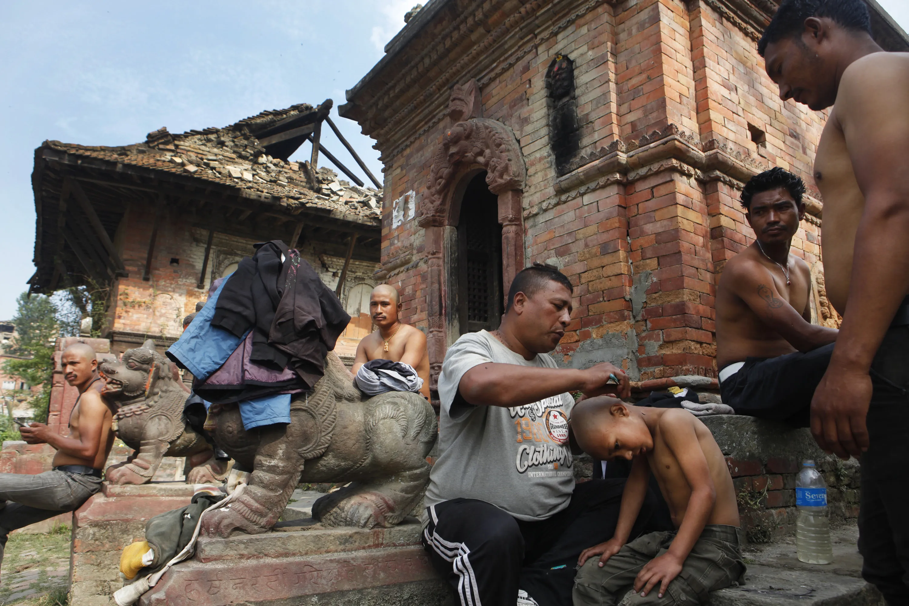 A young Nepalese, who lost a family members to the April 25 earthquake, receives a ritualistic tonsure as he prepares to end the mourning period, on the banks of Hanumante River in Bhaktapur, Nepal, Wednesday, May 6, 2015. (Photo by Niranjan Shrestha/AP Photo)