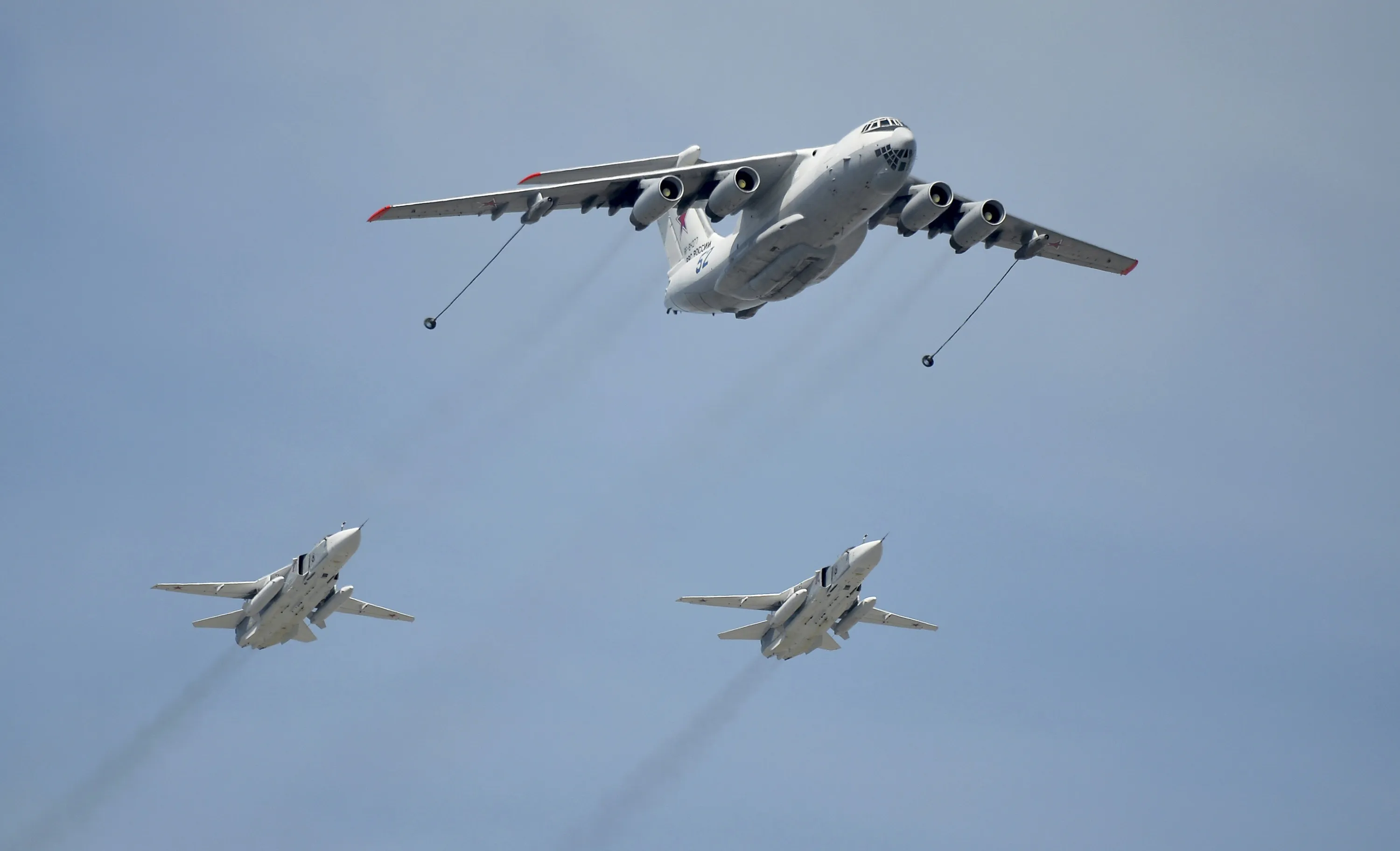 An Ilyushin Il-78 Midas air force tanker and Sukhoi Su-24 Fencer tactical bombers fly over the Red Square during the Victory Day parade in Moscow, Russia, May 9, 2015. (Photo by Reuters/Host Photo Agency/RIA Novosti)