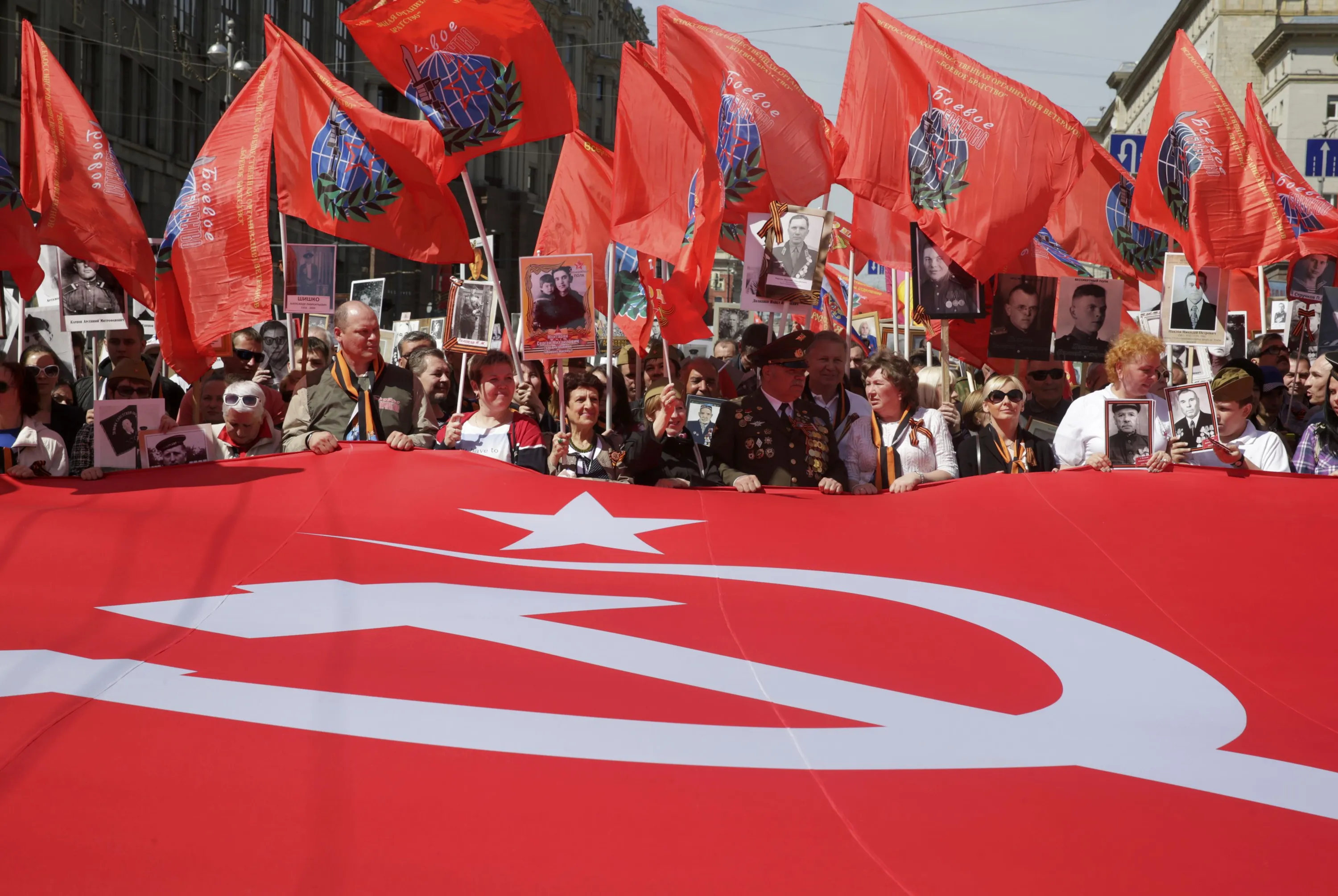 People hold a banner, a replica of the so-called Victory Standard which was erected at the top of the Reichstag building in Berlin at the end of World War Two, as they take part in the Immortal Regiment march during the Victory Day celebrations in central Moscow, Russia, May 9, 2015. (Photo by Tatyana Makeyeva/Reuters)