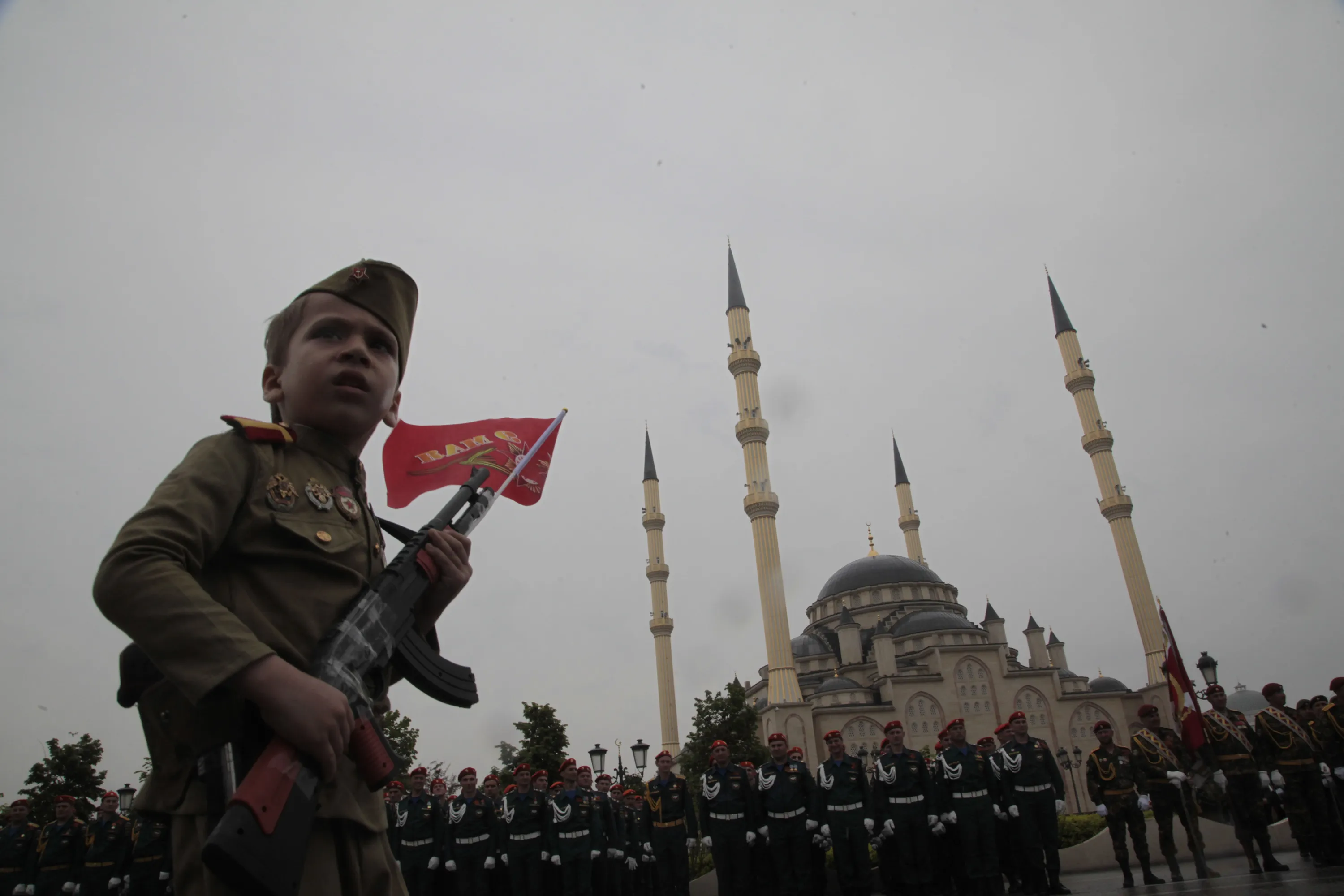 A boy wearing a Soviet era uniform carries a toy gun as he walks past a mosque during celebrations marking the 70th anniversary of the victory over Nazi Germany, in Chechnya's provincial capital Grozny, Russia, Saturday, May 9, 2015. (Photo by Musa Sadulayev/AP Photo)