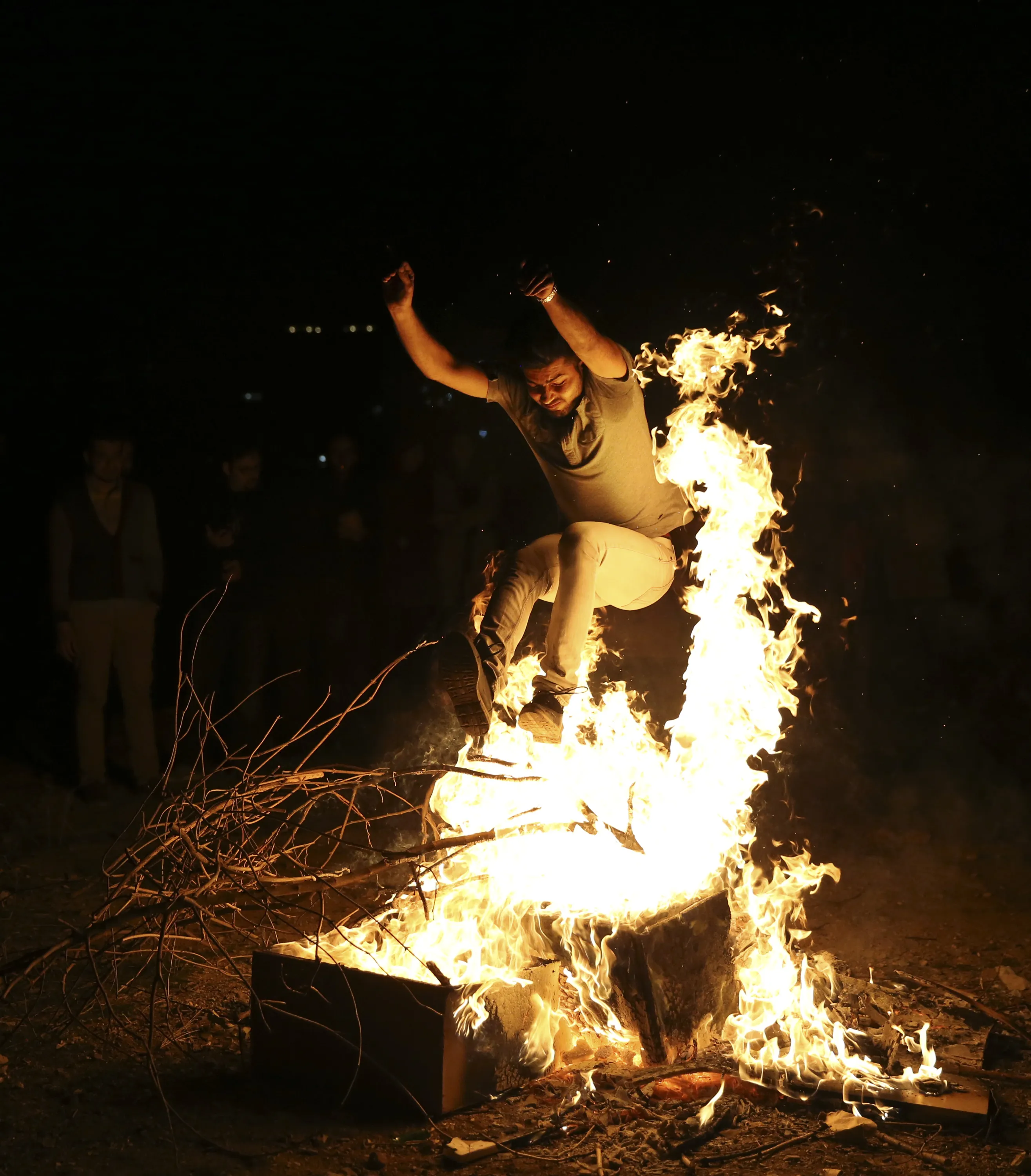 An Iranian man jumps over a bonfire during Chaharshanbe Souri, or Wednesday Feast, an ancient Festival of Fire, on the eve of the last Wednesday of the solar Persian year, in Tehran, Iran, Tuesday, March 17, 2015. (Photo by Vahid Salemi/AP Photo)