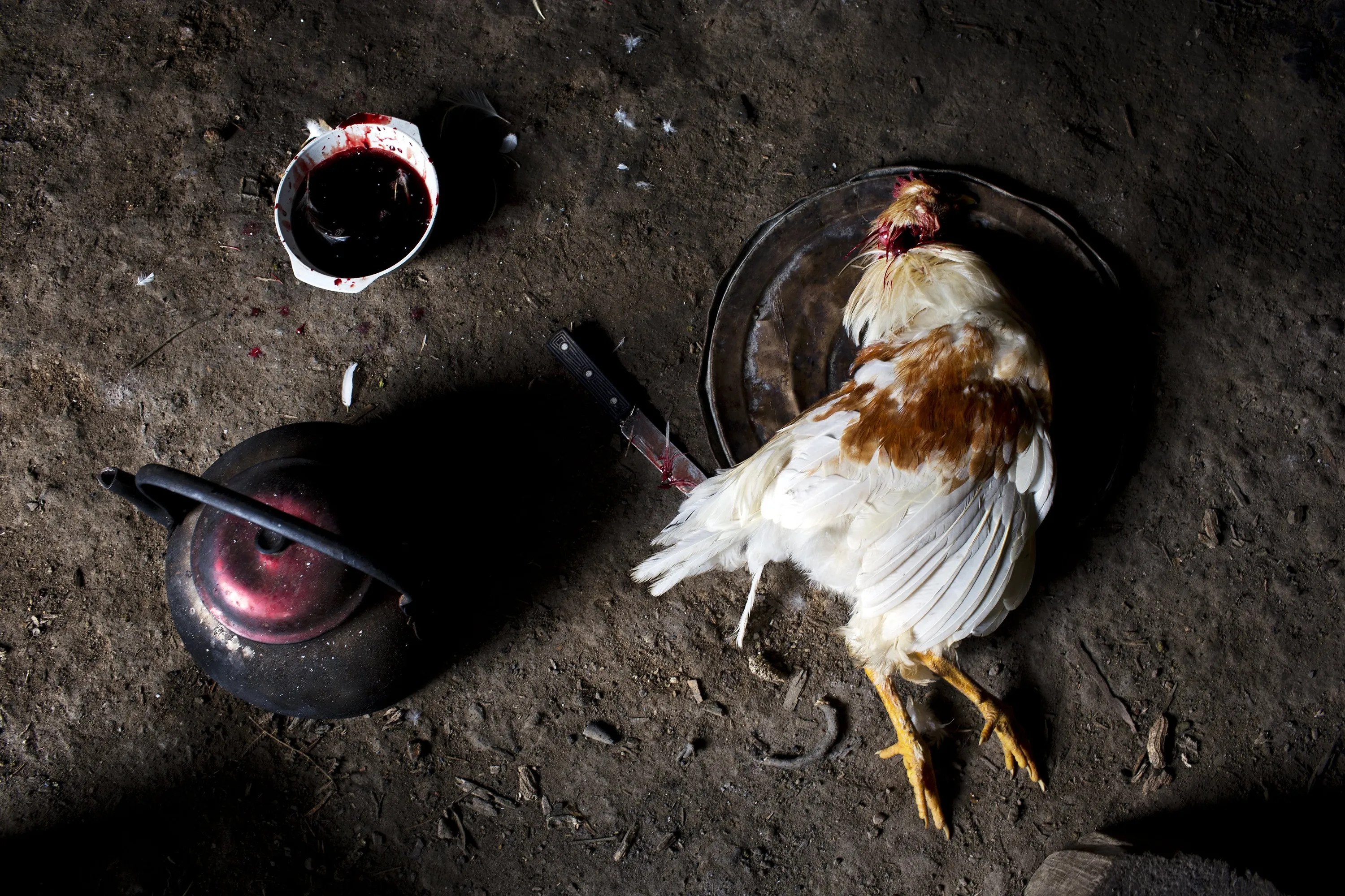 In this March 15, 2015 photo, a slaughtered chicken sits on a pan lid, to be used in a soup for a special dinner marking the second anniversary of the death of Yuri Galvez, in La Mar, province of Ayacucho, Peru. Galvez, 25, was killed in March 2013 during a cocaine smuggling trip. Deaths of cocaine backpackers often go unreported. Bodies lack identification papers, and villagers quietly bury them. (Photo by Rodrigo Abd/AP Photo)