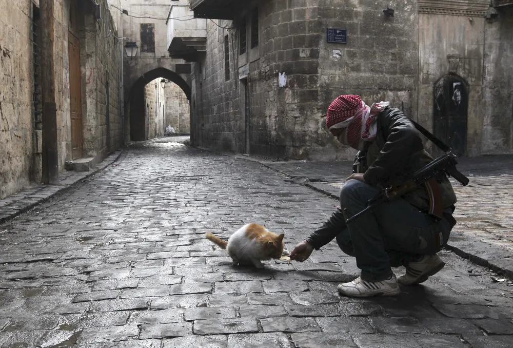 A “Free Syrian Army” fighter feeds a cat in the old city of Aleppo, Syria January 6, 2013. (Photo by Muzaffar Salman/Reuters)