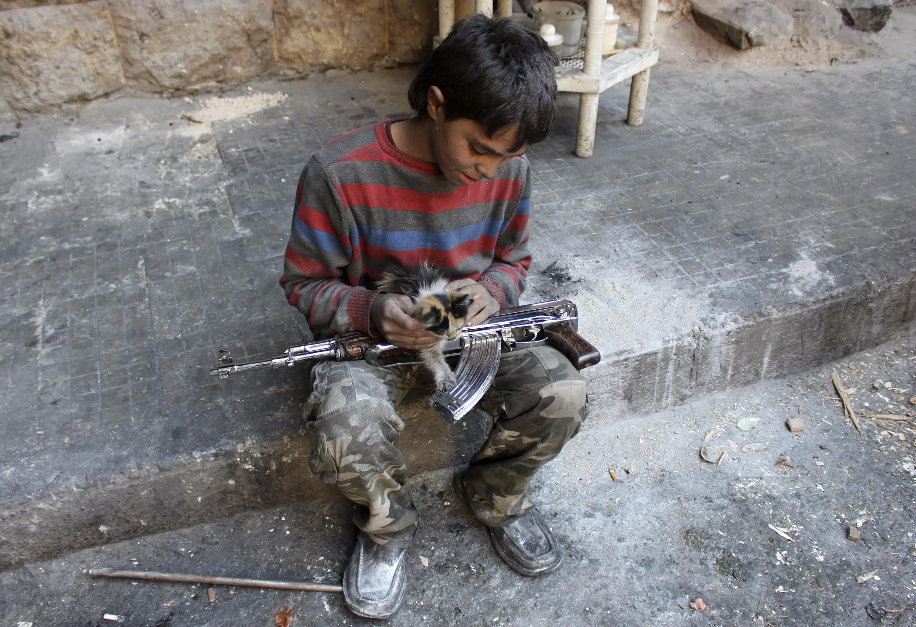 Mohammad, a 13-year-old fighter from the “Free Syrian Army”, plays with a cat in Aleppo's Bustan al-Basha district, Syria October 28, 2013. Mohammad joined the Free Syrian Army after his father died during clashes with the Syrian regime. The gun he is using was his father's. (Photo by Molhem Barakat/Reuters)