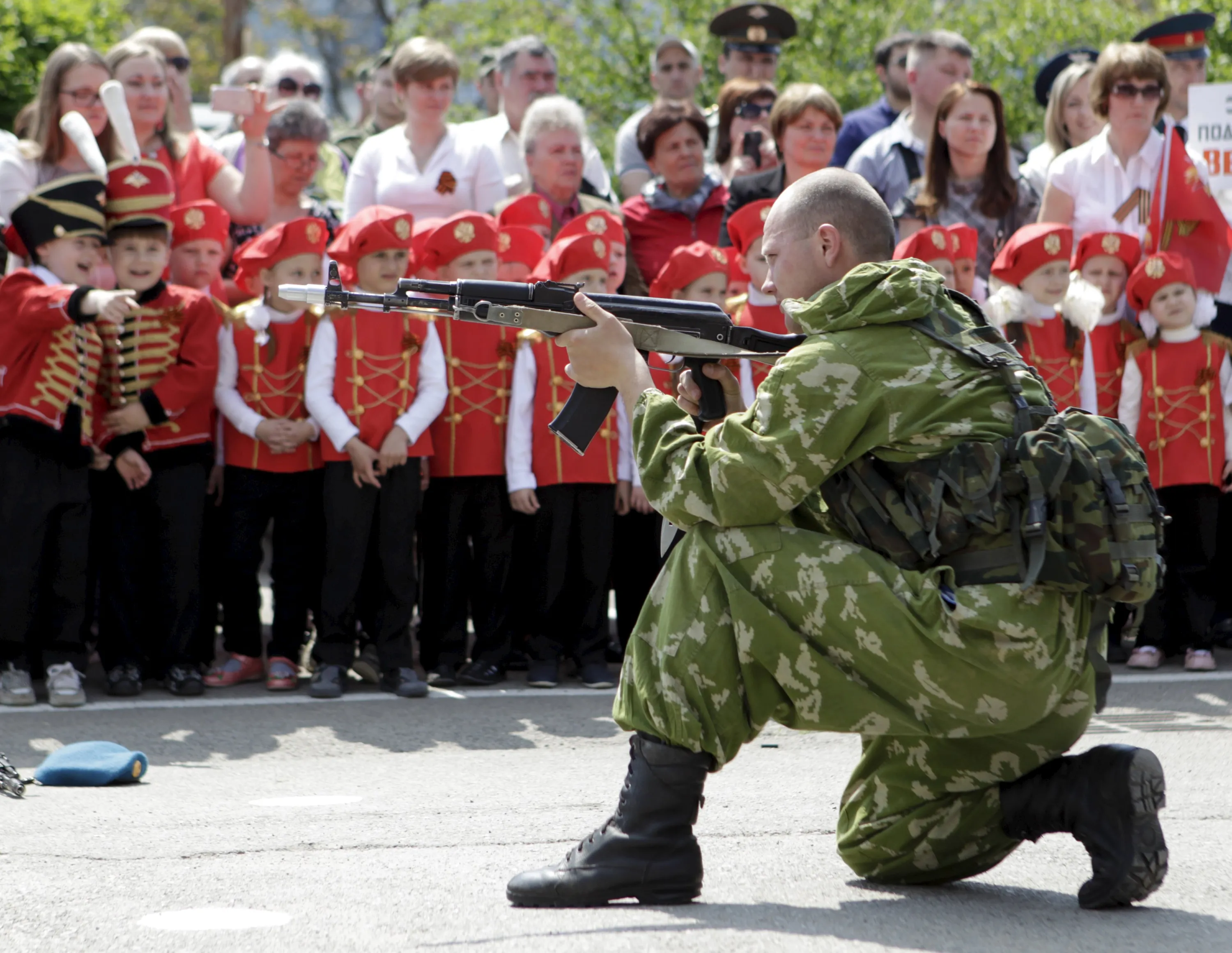 A Russian paratrooper performs as children gather in the background during the so-called parade of children's troops in Rostov-on-Don, southern Russia, May 14, 2015. (Photo by Eduard Korniyenko/Reuters)