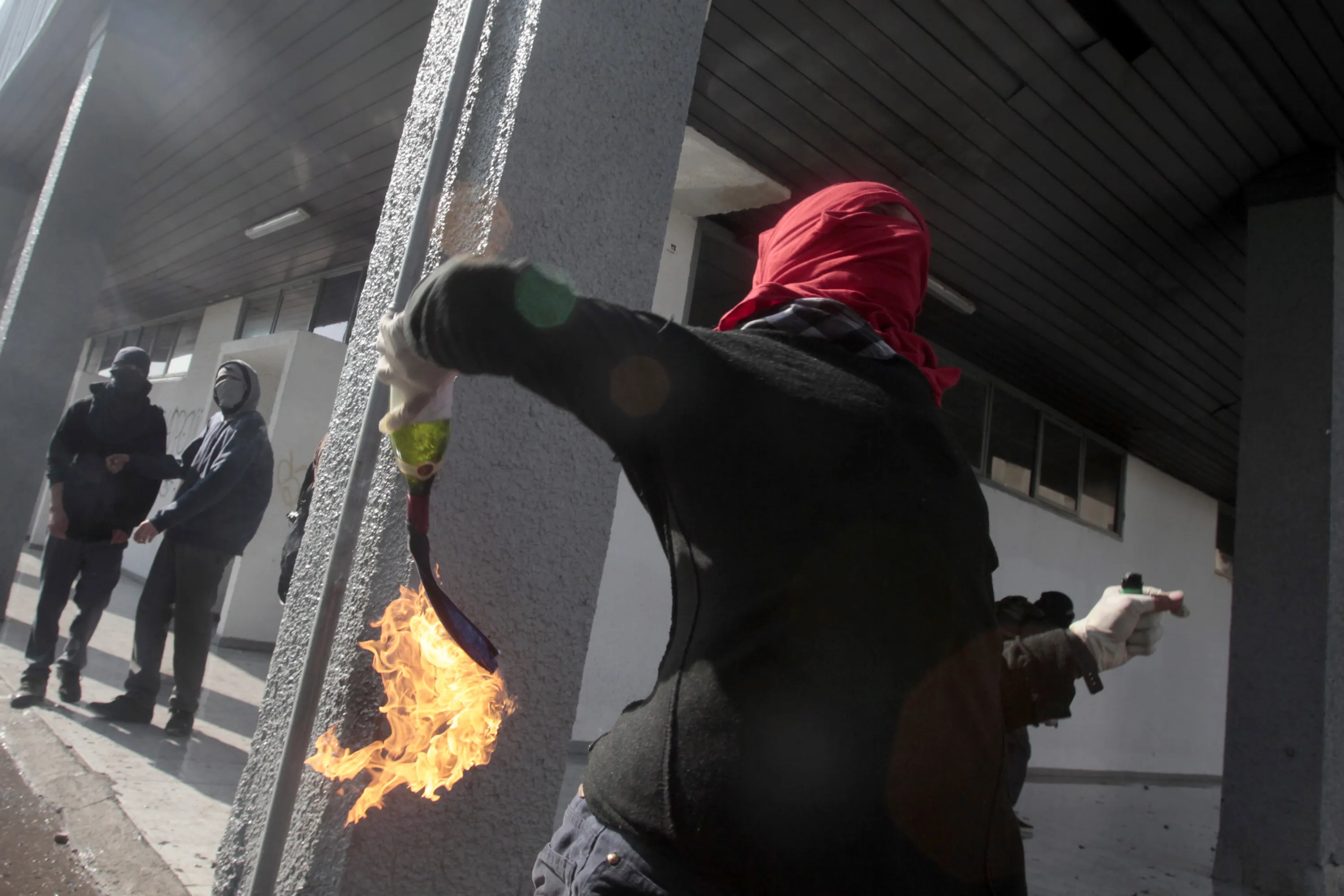 A masked demonstrator readies to throw a petrol bomb towards the police during a protest at the University of Santiago, in Santiago, Chile, Thursday, May 14, 2015. (Photo by Luis Hidalgo/AP Photo)