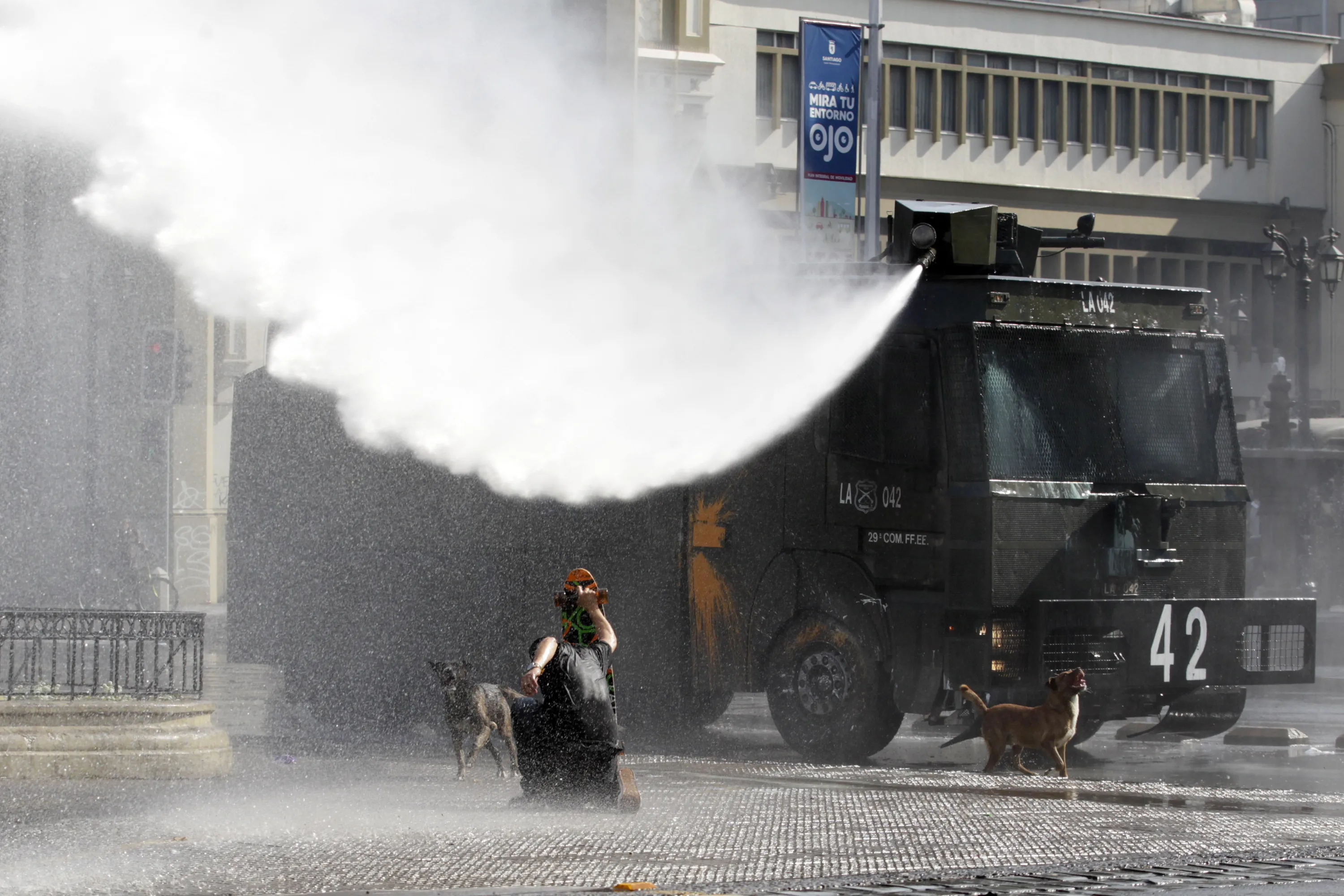 A protester confronts a jet of water shot from a police operated water cannon, during a student protest, in Santiago, Chile, Thursday, May 14, 2015. (Photo by Luis Hidalgo/AP Photo)