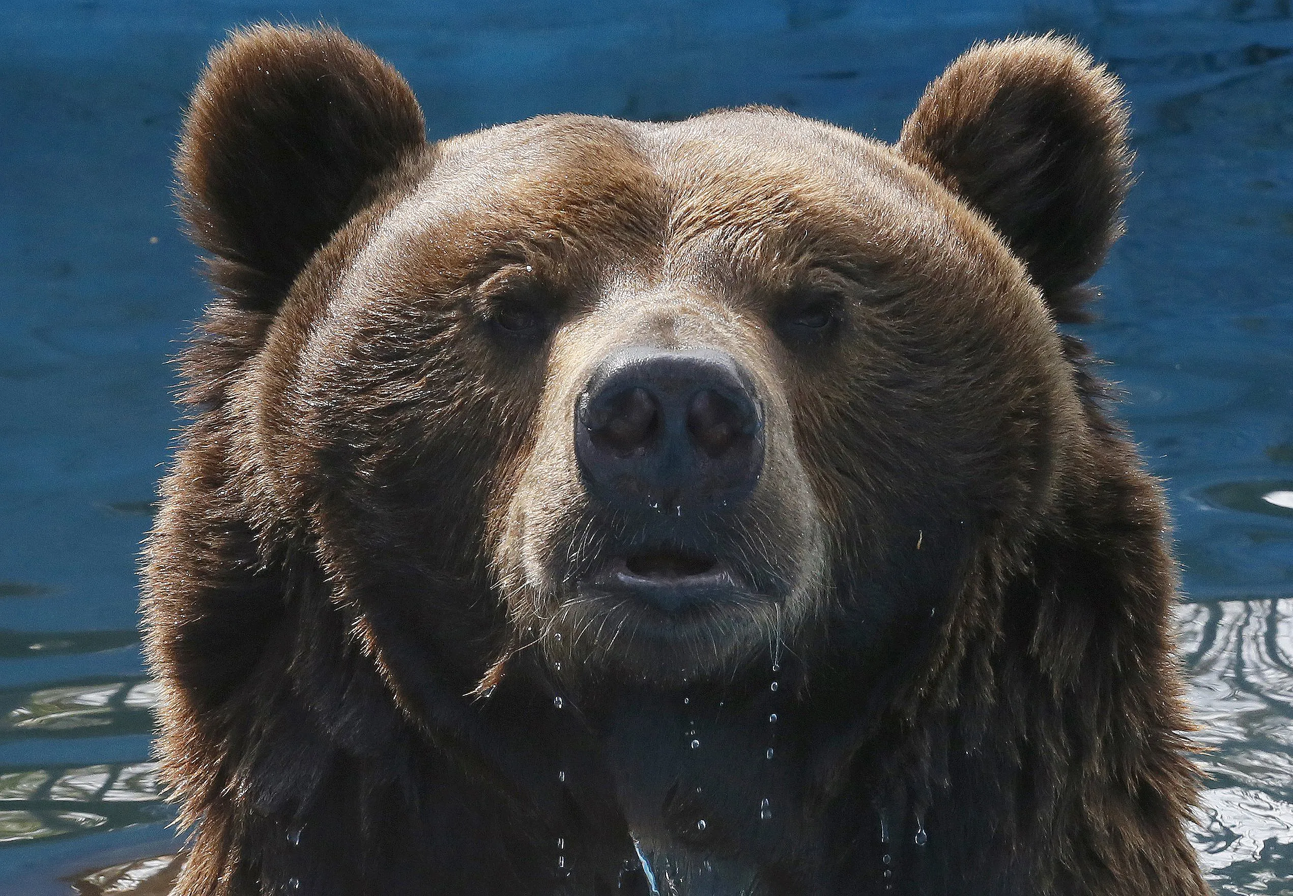Buyan, a 15-year-old male Siberian brown bear, looks out from a pool inside an open-air cage at the Royev Ruchey Zoo in the Siberian city of Krasnoyarsk, Russia, May 15, 2015. (Photo by Ilya Naymushin/Reuters)