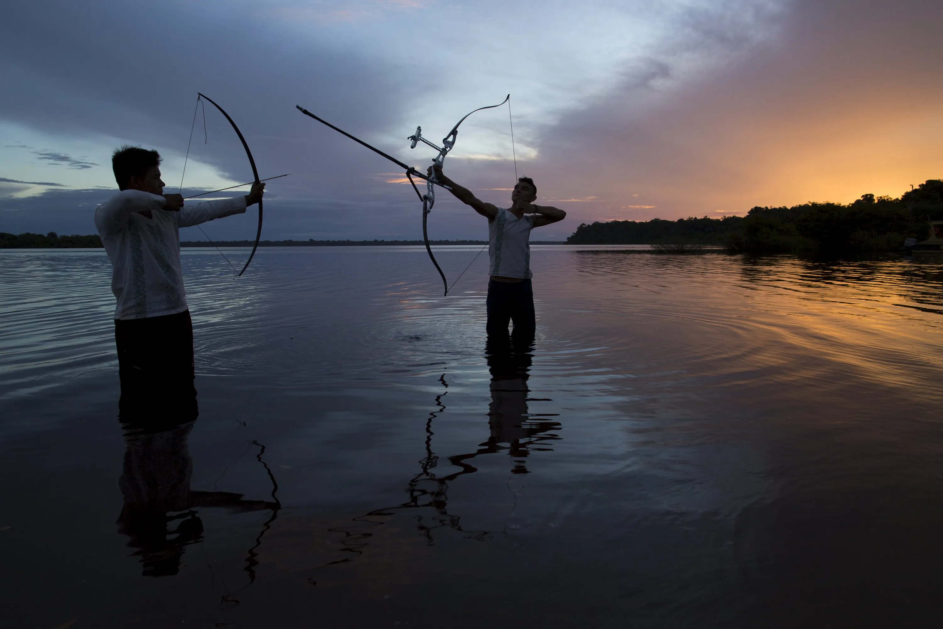 Kambeba Indian, Dream Braga (R), 18, and his friend Nelson Varge da Silva, pose for pictures at sunset on the banks of the Negro river at the village Tres Unidos, Amazon state May 9, 2015. (Photo by Bruno Kelly/Reuters)