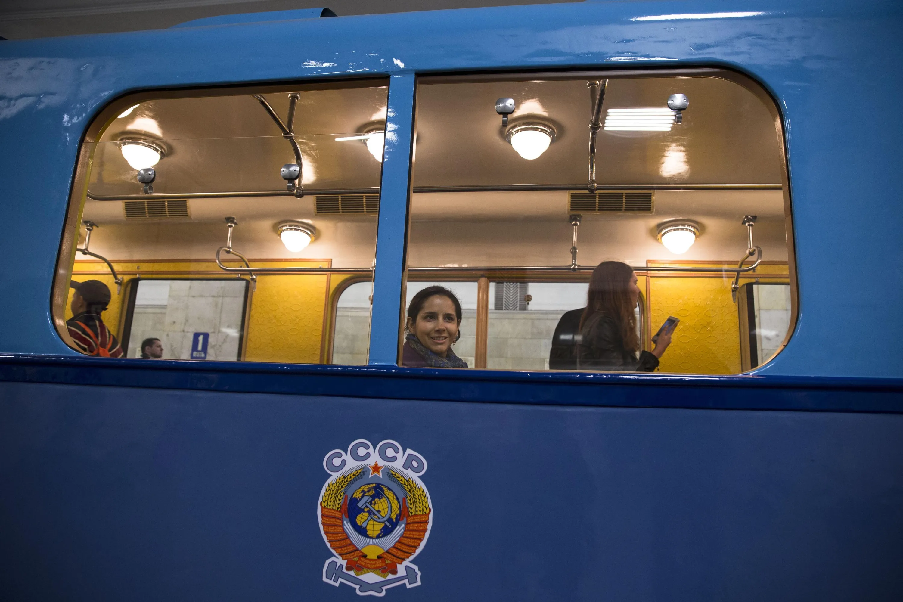 A woman looks in the window in a Soviet-era vintage subway car, with a Soviet railways emblem on it, parked in the Partizanskaya subway station in Moscow, Russia, Friday, May 15, 2015. (Photo by Pavel Golovkin/AP Photo)