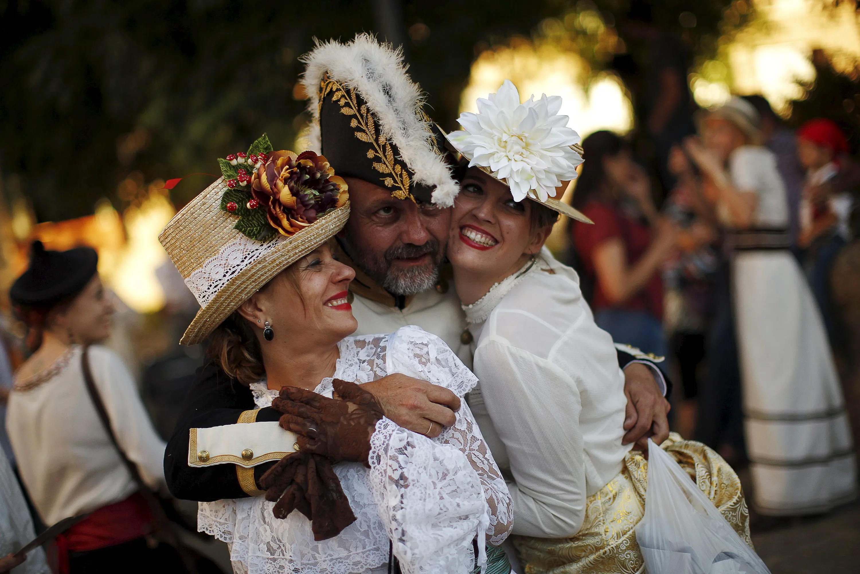 A man (C) dressed in early nineteenth century French army uniform and women dressed as bourgeoises pose for a friend as they participate in the third edition of “Ronda Romantica” (Romantic Ronda) in Ronda, southern Spain, May 16, 2015. (Photo by Jon Nazca/Reuters)