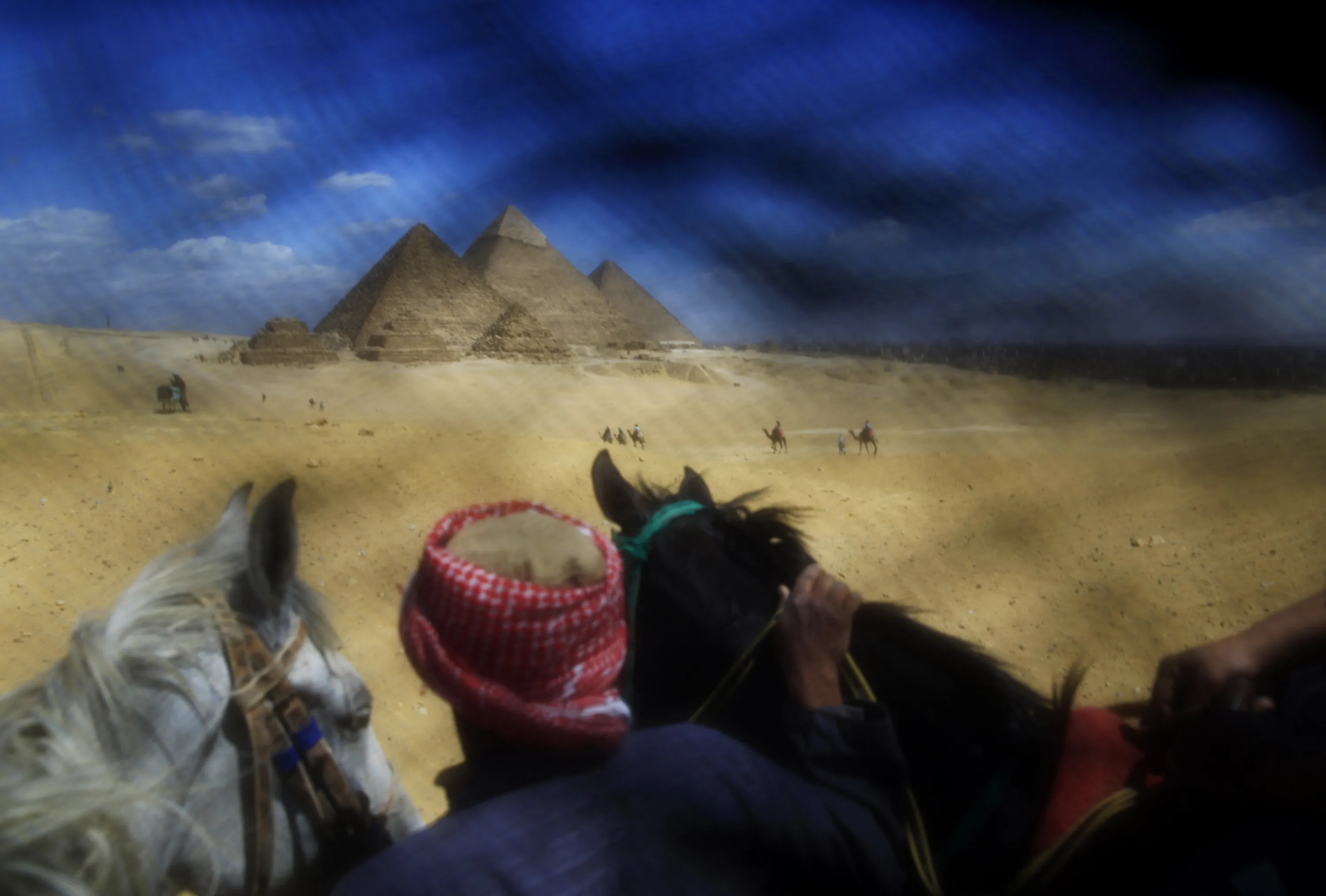 This Thursday, April 9, 2015 photo shows a man leading tourists riding horses at the historical site of the Giza Pyramids near Cairo. This photo was shot through the lowered veil of a niqab, which is worn by some conservative Muslim women. The cloth allows women to follow a strict interpretation of their religious beliefs by preventing others from seeing their faces. (Photo by Hassan Ammar/AP Photo)