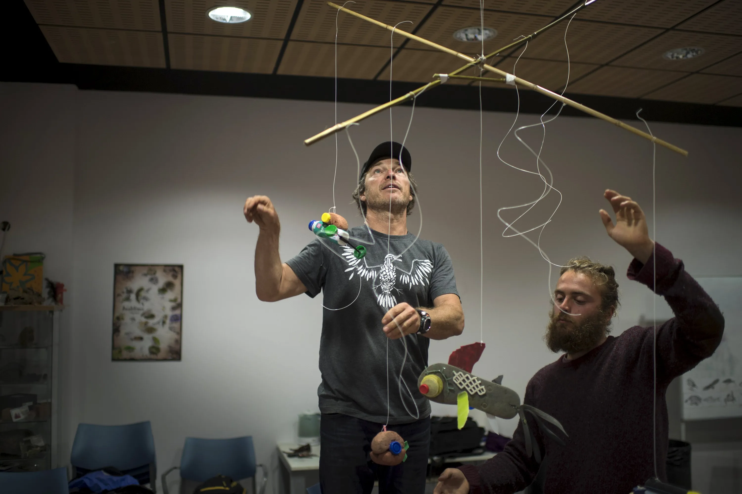 Xandi Kreuzeder (L) and Claudio Indao, surfers and members of the Skeleton Sea art collective, arrange a mobile during a workshop on how to make sculptures from plastic waste collected from the sea at the Torre Madariaga Biodiversity Centre in Busturia, Spain, May 17, 2015. (Photo by Vincent West/Reuters)