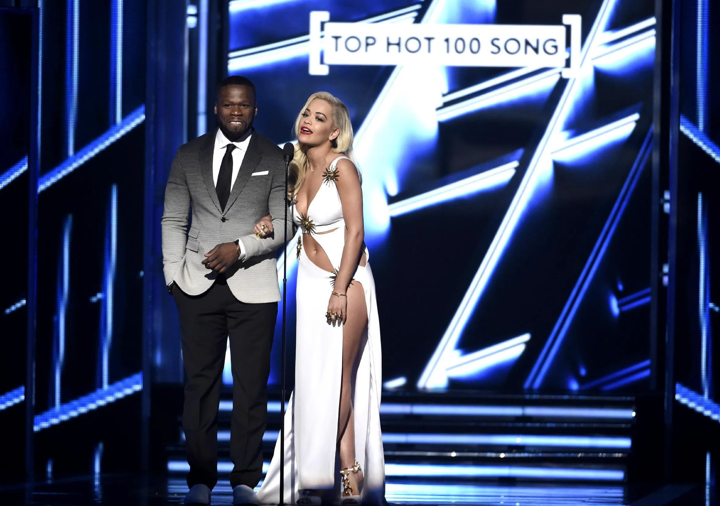 50 Cent, left, and Rita Ora present the award for top hot 100 song at the Billboard Music Awards at the MGM Grand Garden Arena on Sunday, May 17, 2015, in Las Vegas. (Photo by Chris Pizzello/Invision/AP Photo)