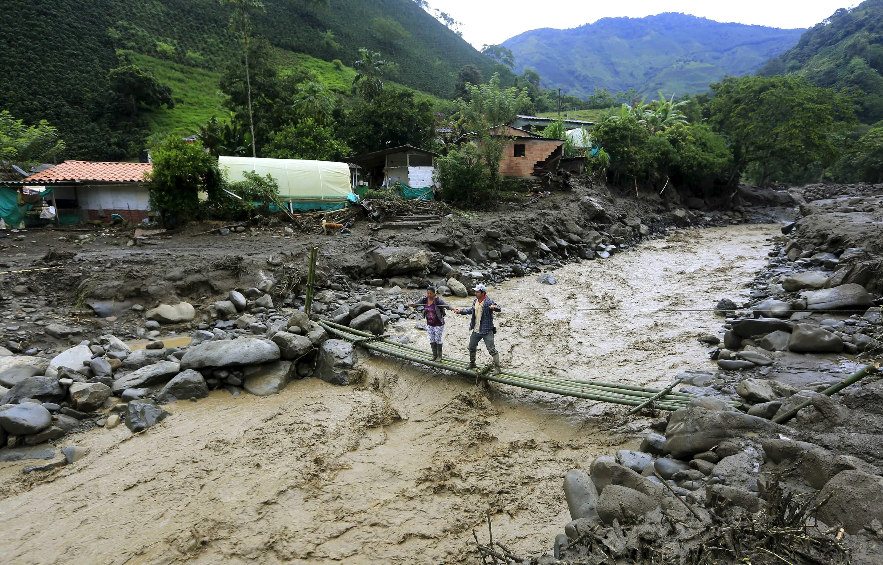 Residents cross over an improvised bridge after a landslide sent mud and water crashing onto homes close to the municipality of Salgar in Antioquia department, Colombia May 19, 2015. (Photo by Jose Miguel Gomez/Reuters)