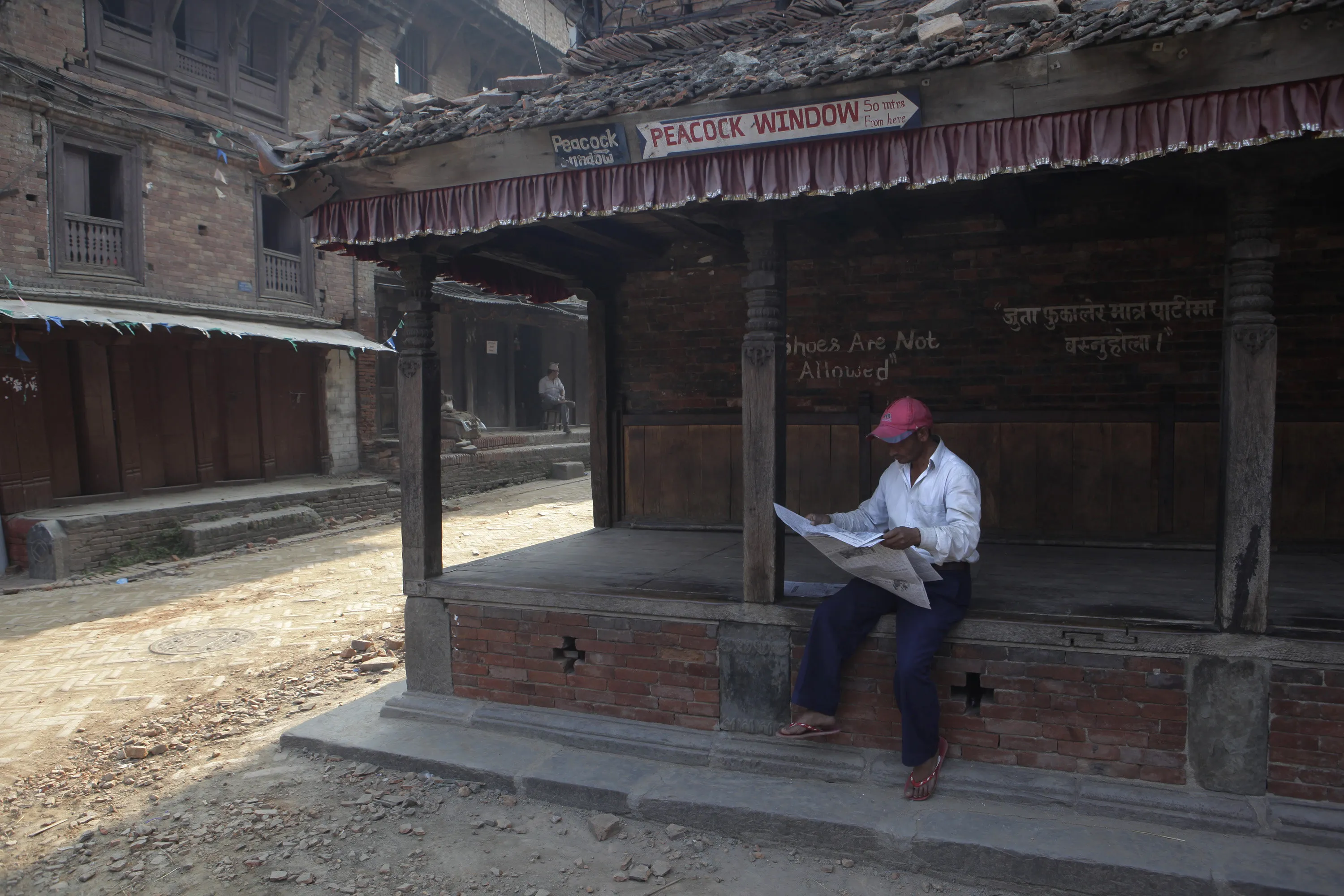 A Nepalese reads a newspaper in a partially damaged structure in Bhaktapur, Nepal, Tuesday, May 19, 2015. Nepal is facing billions in reconstruction costs with almost 745,600 buildings and homes damaged or destroyed, including at least 87,700 in the capital, according to Nepal's emergency authority. (Photo by Niranjan Shrestha/AP Photo)