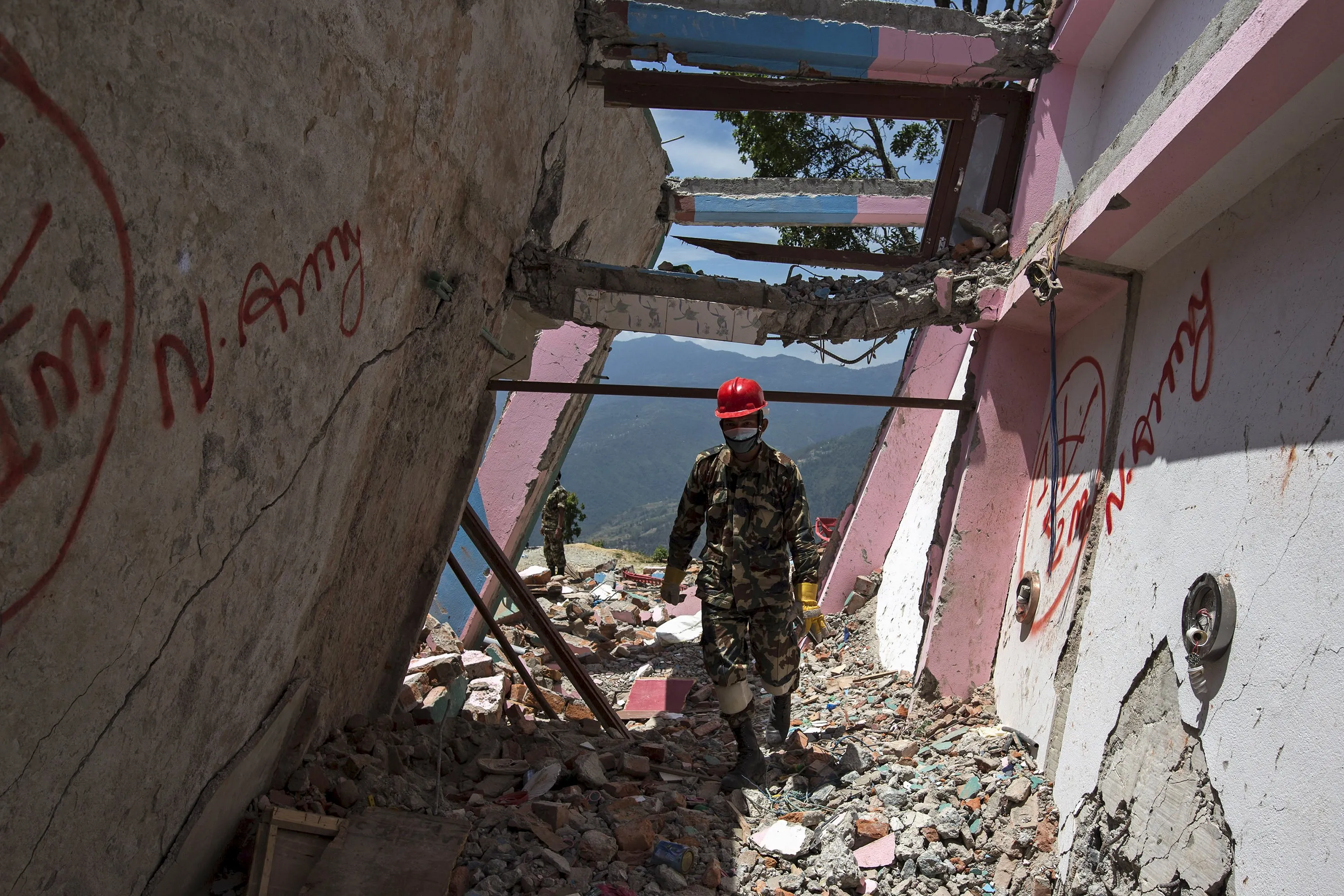 A Nepalese military personnel walks inside a collapsed building after Tuesday's earthquake at Charikot Village, in Dolakha, Nepal, May 14, 2015. (Photo by Athit Perawongmetha/Reuters)