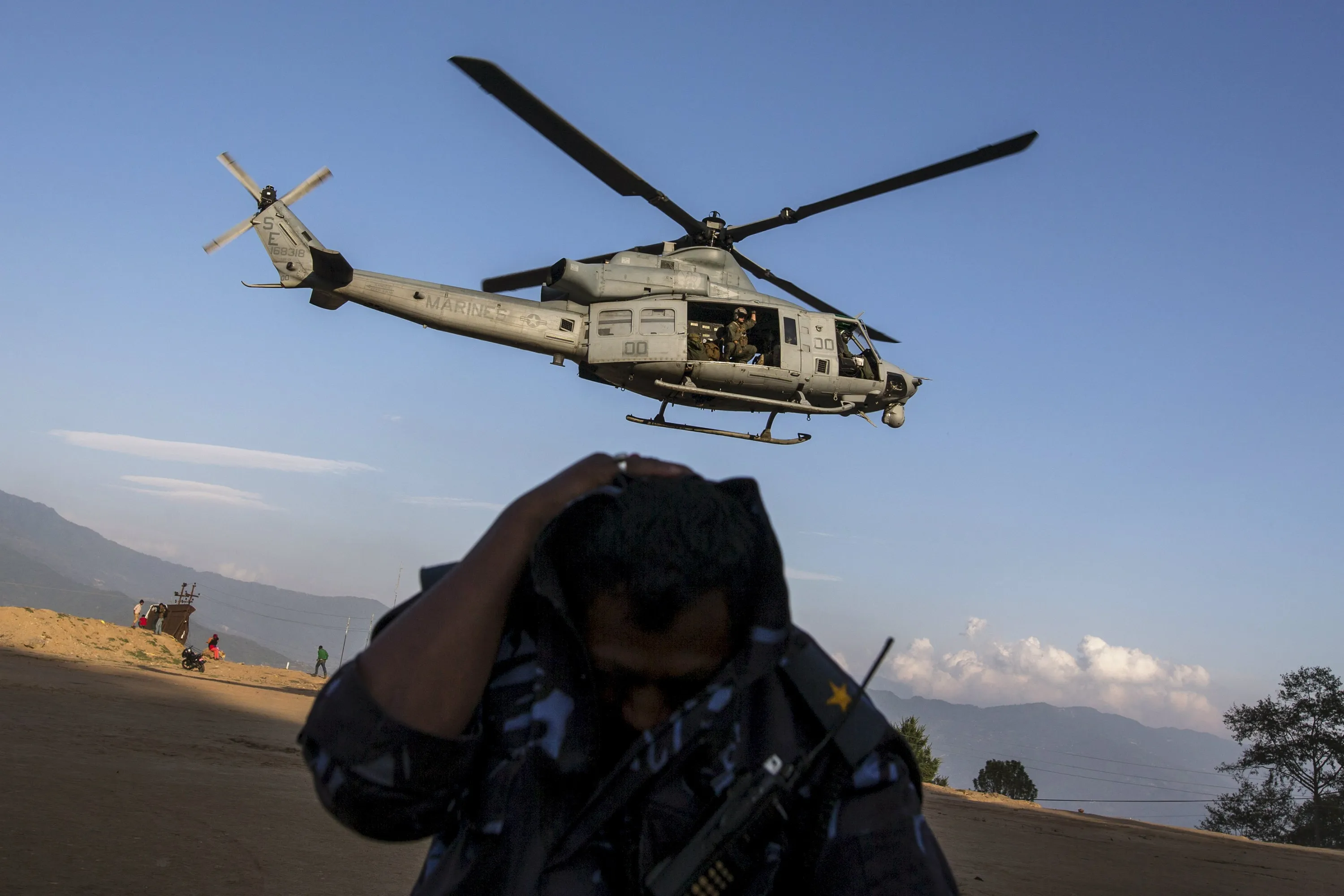 A Nepalese military personnel takes cover as an UH-1Y, belonging to the U.S. military, takes off after Tuesday's earthquake at Charikot Village, in Dolakha, Nepal, May 14, 2015. Picture taken May 14, 2015. (Photo by Athit Perawongmetha/Reuters)