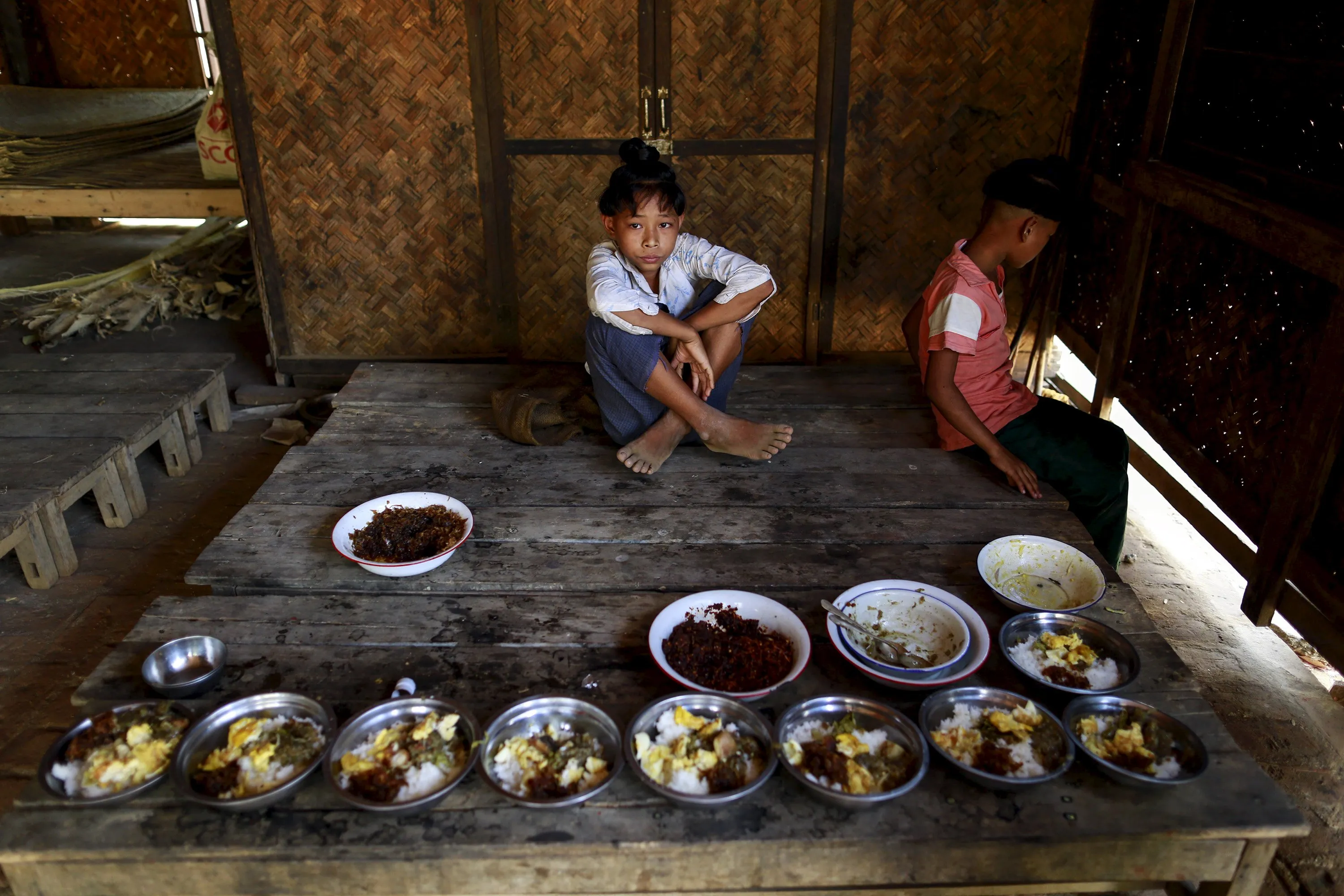 Boys who sort the ancient hairstyle known as Sanyitwine wait for their lunch in a monastery at Sat Sat Yo village in Nyaung Oo township, near Myanmar's ancient city Bagan April 17, 2015. (Photo by Soe Zeya Tun/Reuters)